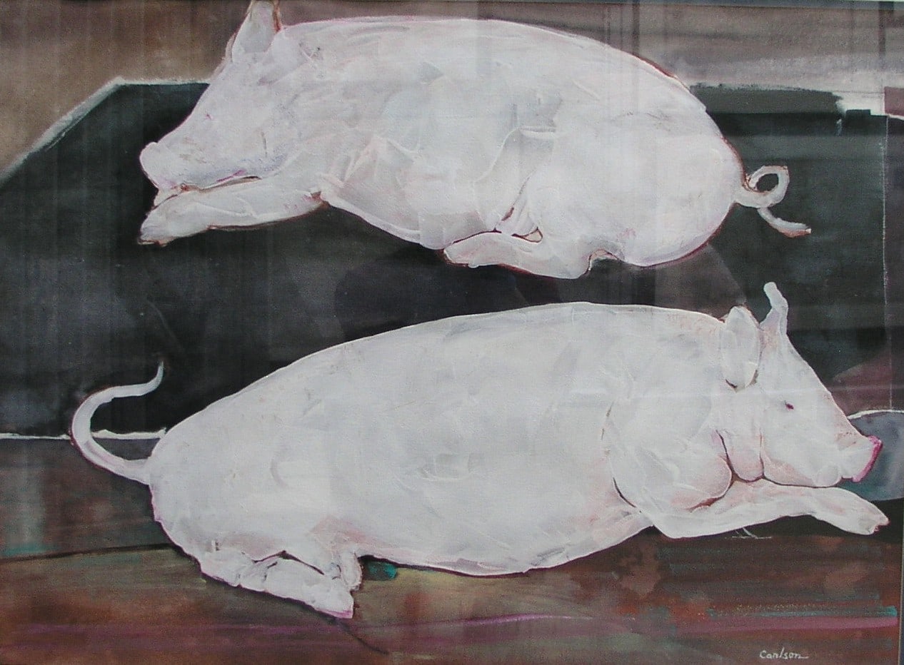 Acrylic painting; "Untitled (2 Pigs at Littleton Museum)", by Betty Carlson, 1982; painting depicts two pigs laying down; upper pig on black parallelogram, facing to left of image, front leg pointing to left below head, with curled tail; lower pig partially covering black portion of image, facing right, leg pointing right below head, tail slightly curved; black portion of painting has whitish-grey border, with brown in upper left corner; pigs are pinkish-white in color, with lower pig having a pink snout.