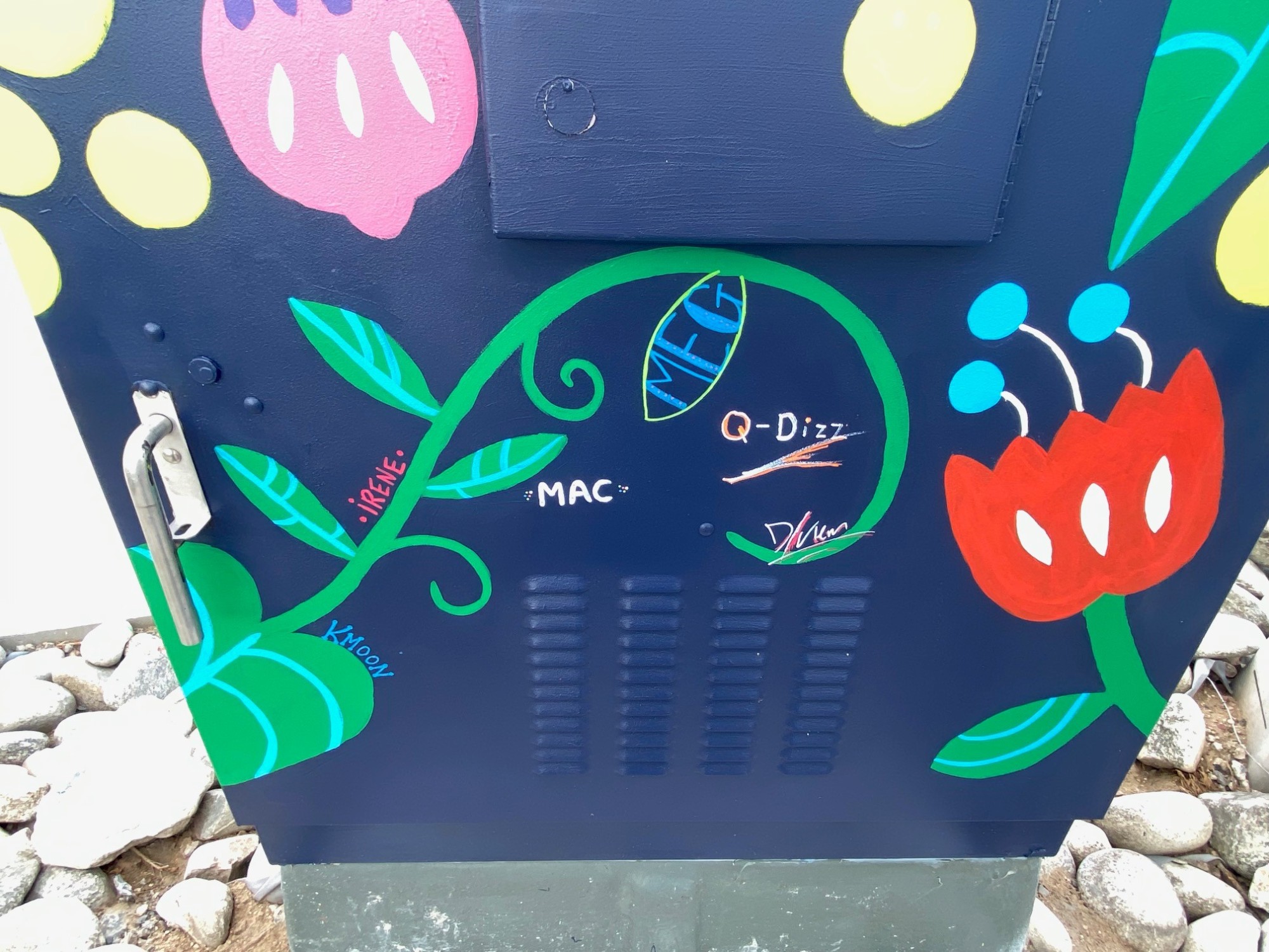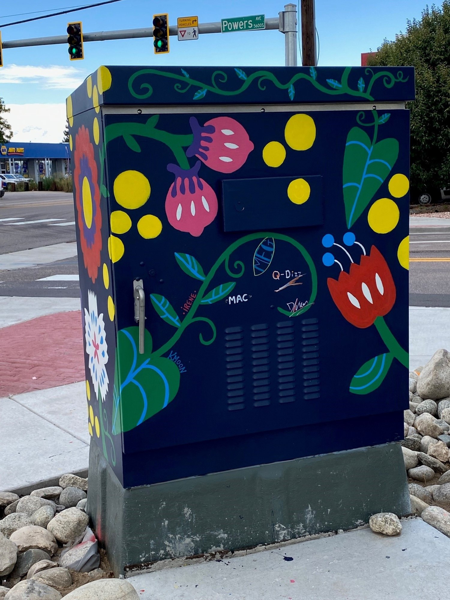 Untitled - abstract flowers by Megan Clement and friends. Painted traffic box by artist Megan Clement and her family and friends, August 4-6, 2023. Located at the northeast corner of South Broadway and Powers Ave.