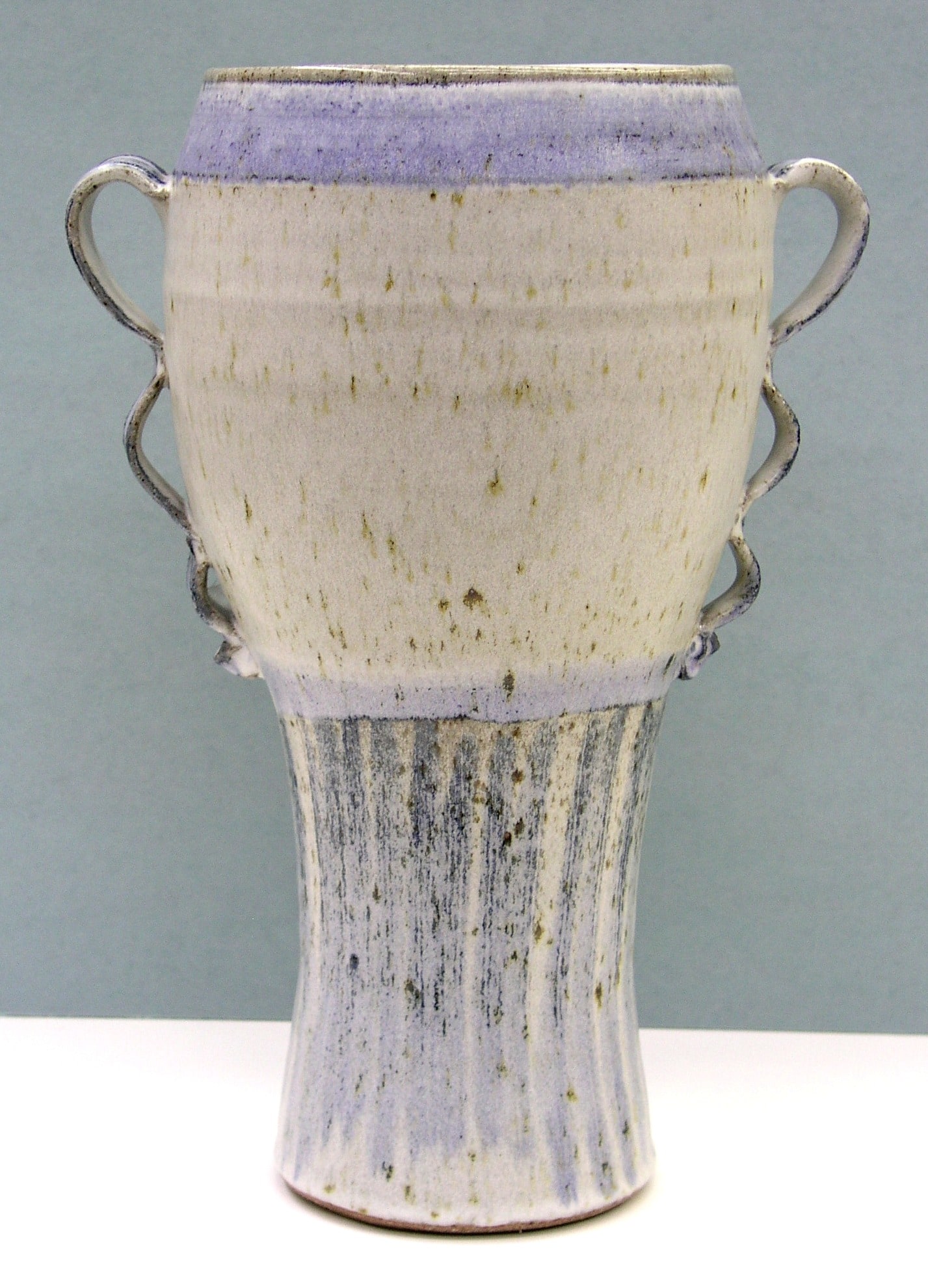 Untitled stoneware vase by Carolyn C. Thompson, 1984; lavender and beige glaze with handles on two sides.