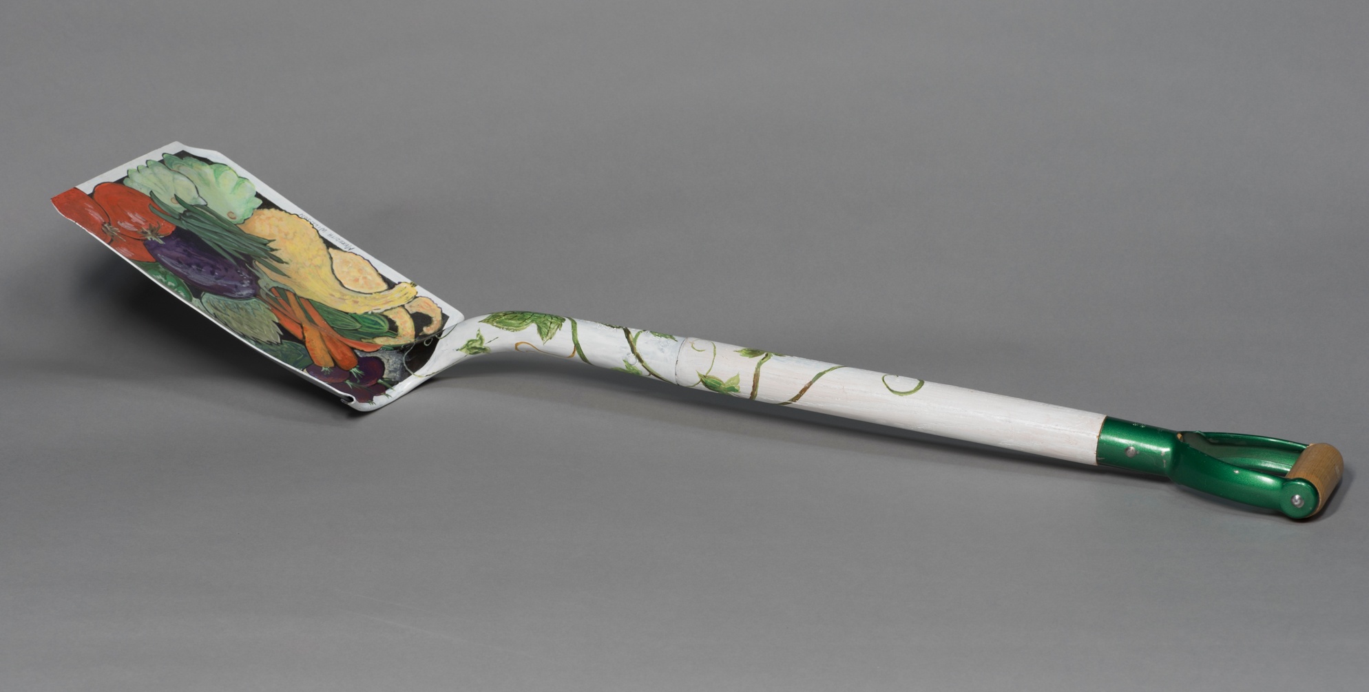 Shovel painted with a multitude of colors; shows a design of assorted vegetables with vine winding around shovel, near handle.