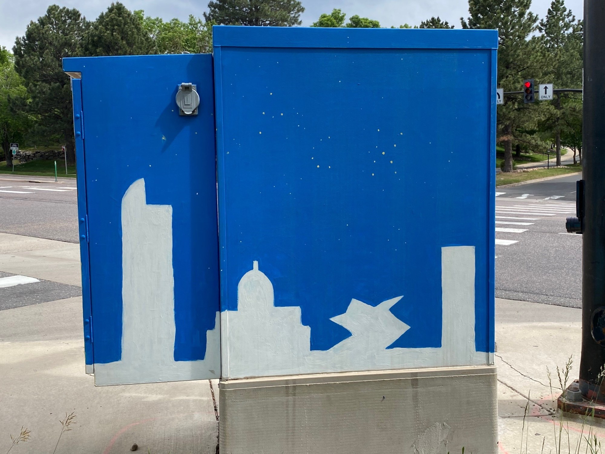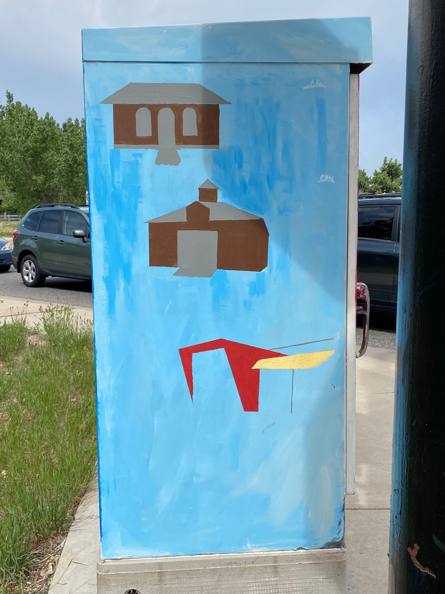 One of 10 traffic boxes as part of partnership between City of Littleton and Sudee Floyd of Outnumbered Gallery. Originally painted by MacIntosh Academy students, in fall of 2016. More information such as title and artist names are unknown; if you have information that would help document this artwork, please contact 303-795-3954 or email [email protected]