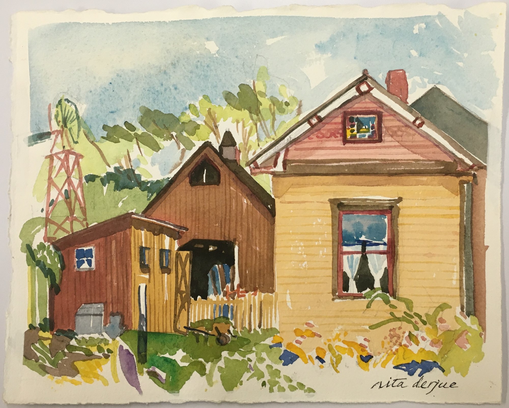 Watercolor painting on white paper, by rita derjue; image of 1890 farm house, smoke house, windmill, & horse barn at Littleton Museum; colors include blues, purple, green, brown, tan, rose, etc.; painting edges are jagged (deckled?).