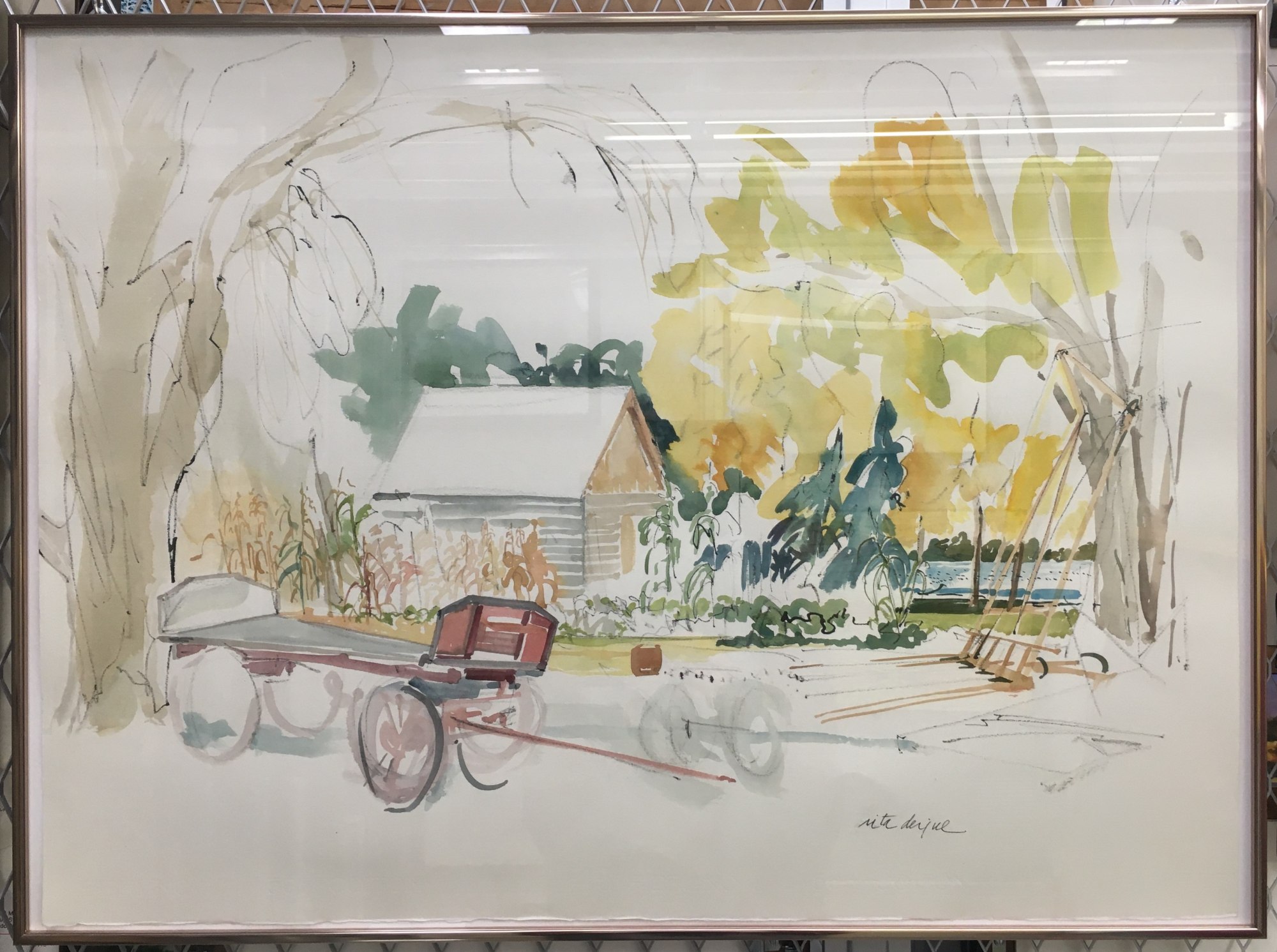 Watercolor & India ink drawing of the schoolhouse on the grounds of the Littleton Historical Museum, by rita derjue. Drawing shows log school in background w/corn field in front of it & the beet wagon in foreground. Colors are greens, yellows & other muted colors. Framed in bronze colored metal frame. Period: October 9, 1980