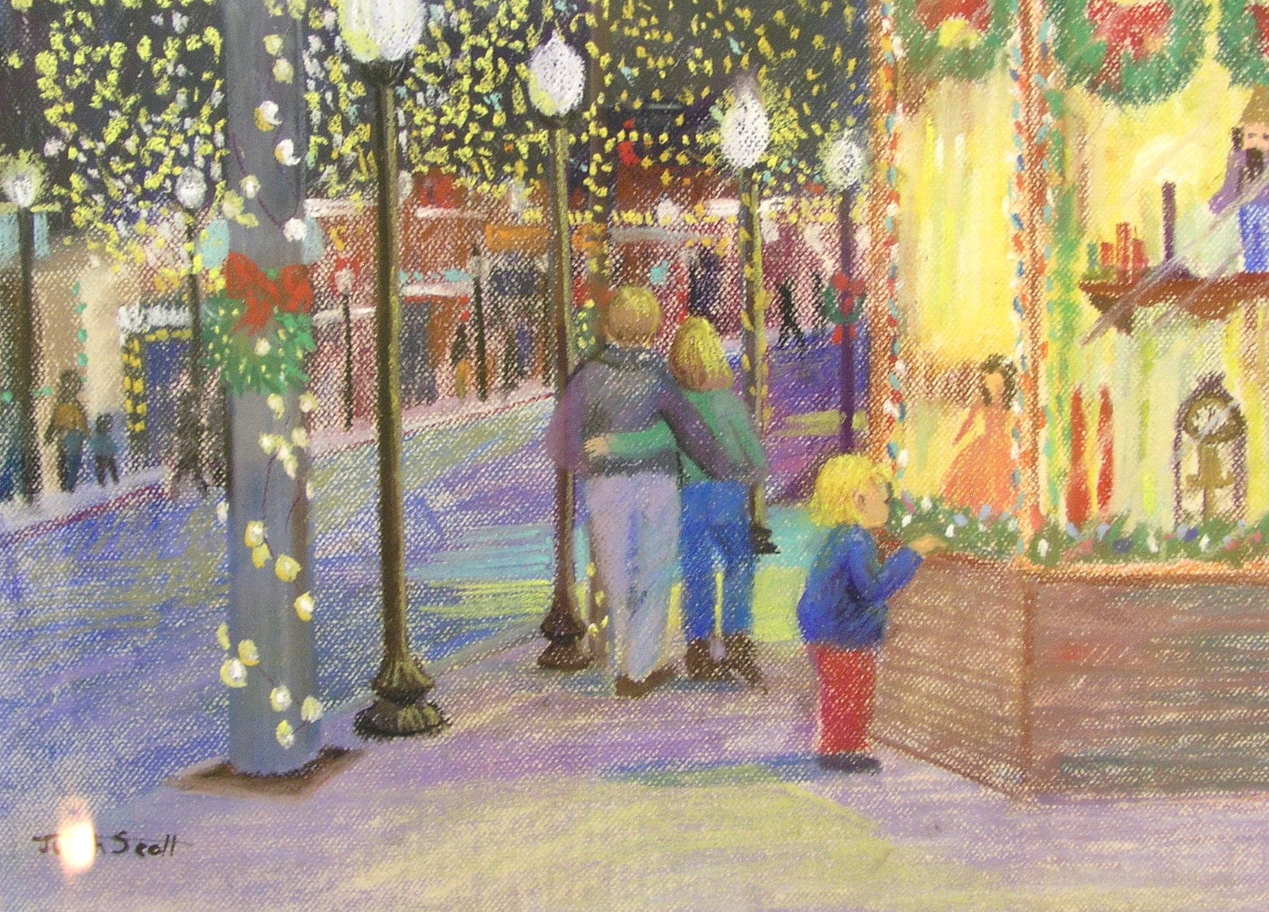 Untitled pastel drawing by Judith A. Scott, 1993; using bright hues. Image is a view of downtown storefronts decorated for Christmas. There is a couple walking together (center), with child looking through store window. Artist used textured heavy artist paper. Signature lower left. Drawing matted with acidic board.