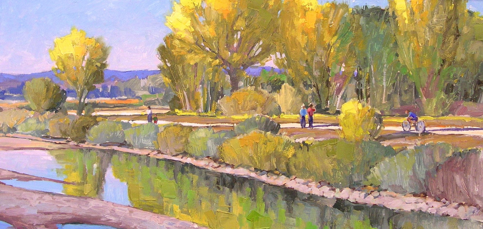 Untitled acrylic painting by Kim Mackey, 1993; done in a highly textured impressionistic style. Image created with fall hues and is a scene from the Platte River looking west toward mountains. There are five people walking along trail by river, one riding a bicycle. Paint applied to smooth side of masonite. Signature lower right. Painting was originally published in the "Littleton, A Special Spirit" brochure, produced by the Bureau of Industry/Affiairs (now City of Littleton Economic Development Department).