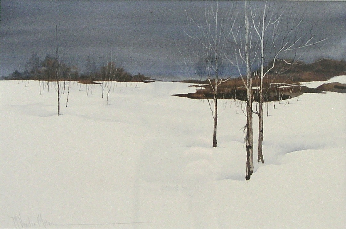 Watercolor of a winter scene depicting a blue-grey sky, snow covered fields, and leafless trees. Artist's signature "M. Vander Molen" appears in pencil on lower left. French mat of white with brown and framed in brown wood.