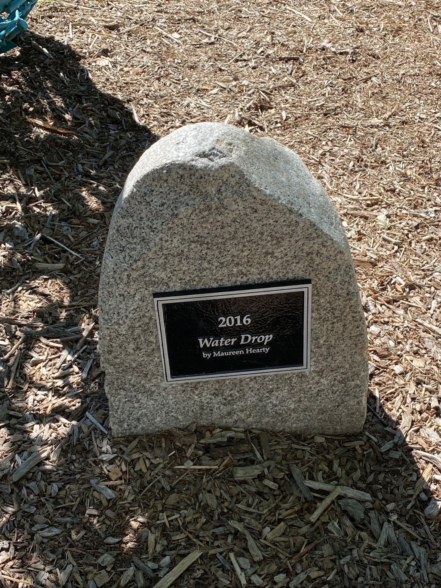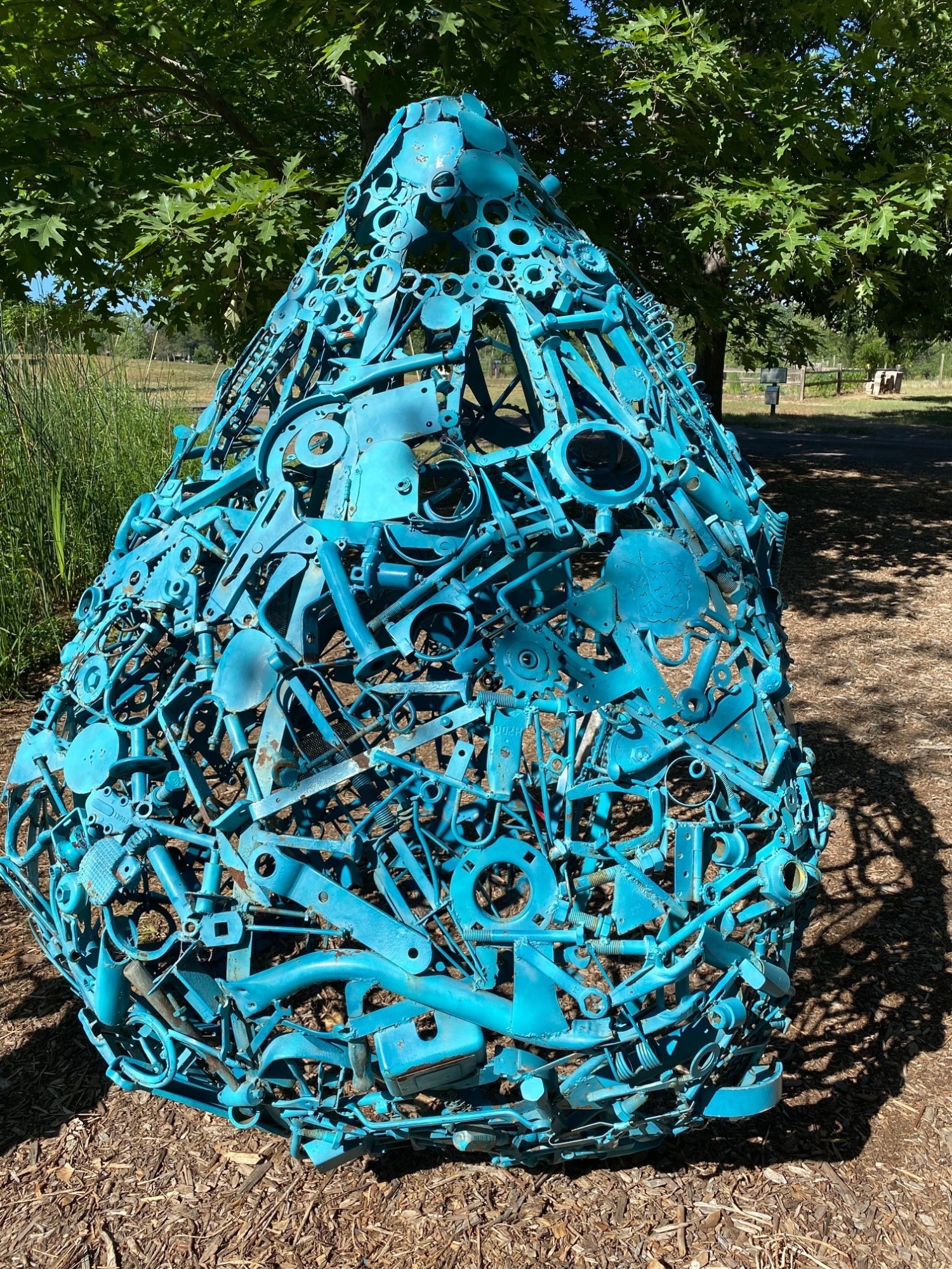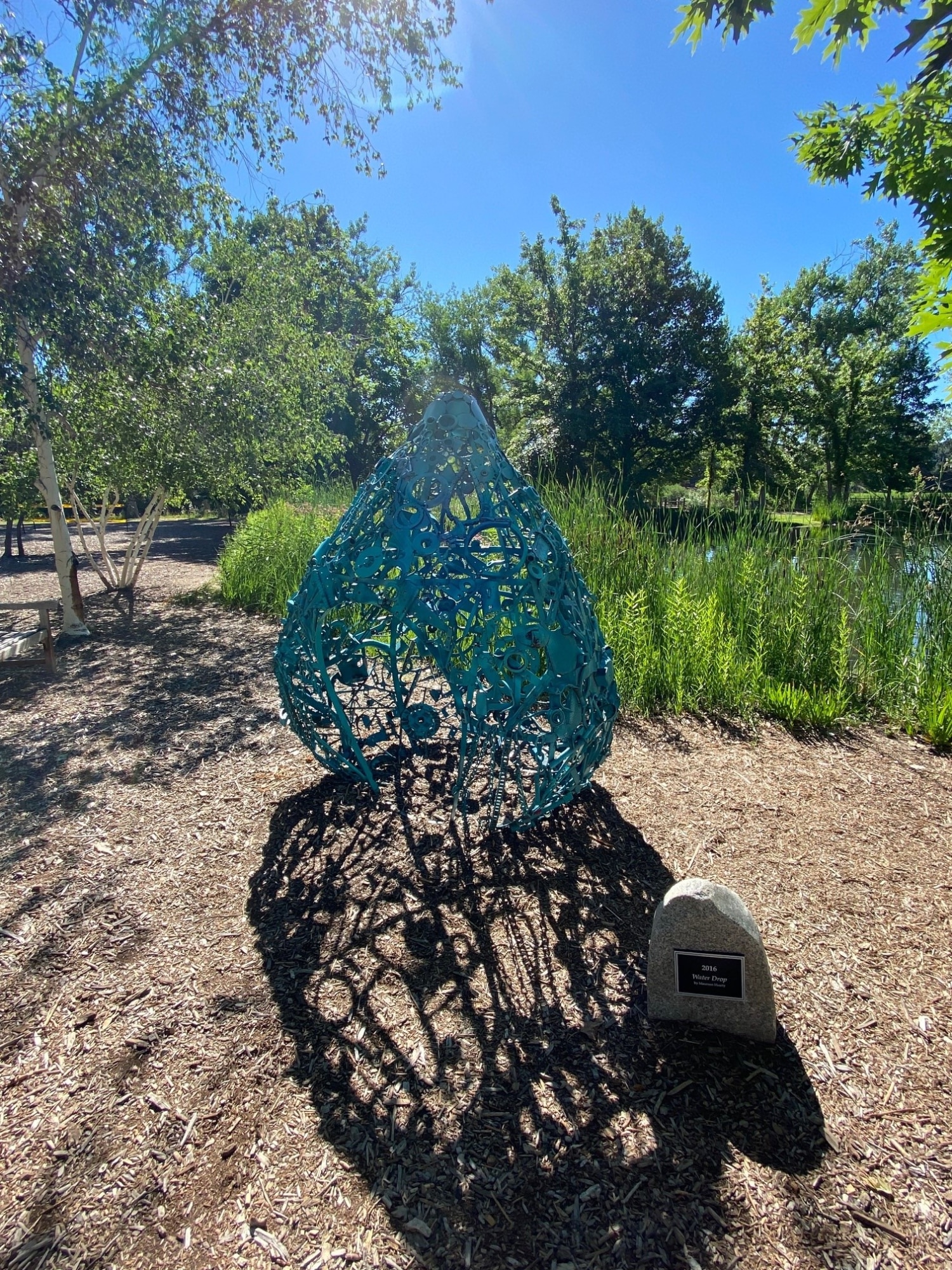 "Water Drop" by Maureen Hearty, date unknown. Located at Hudson Gardens. Large water drop shape, made of welded metal pieces, like wrenches, bolts, chains, etc. Painted aqua blue. Opening at front allows for children to enter.