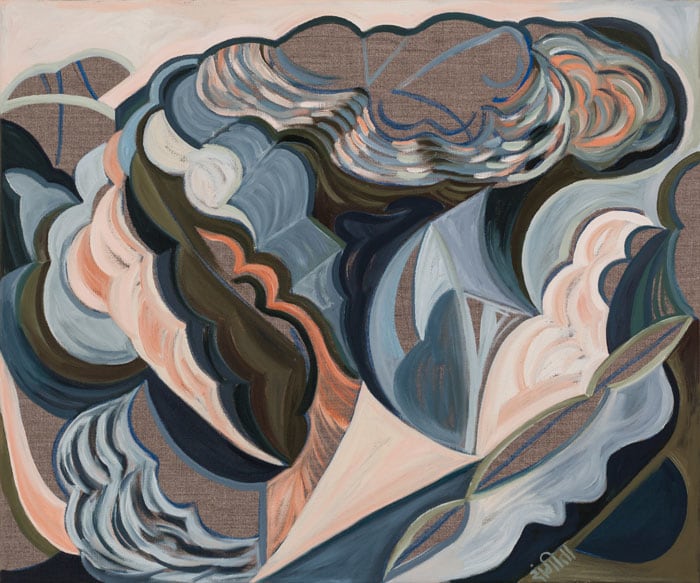 Oil painting; multi-colored, rectangular, abstract oil painting on linen; multiple, curved, irregular shapes of green, blue, grey, pink, and orangish-red; unpainted linen shows through in multiple areas; signed "Sangeeta" in Hindi in grey paint in bottom right corner; wooden stretcher frame.