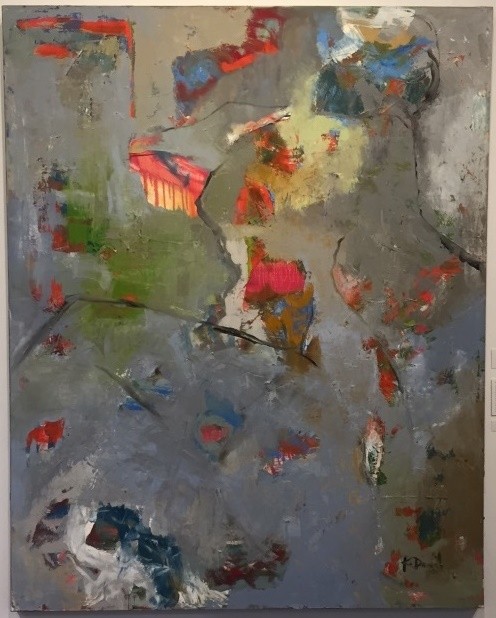 Painting; multi-colored, rectangular, oil and acrylic abstract painting on canvas; grey, blue, green, and brown background colors; black outline of woman at right of center, head at top right, body at top center and center, leg at left center and bottom left; splashes of red, blue, and yellow across surface of painting; black painted edges around entire work; signed in bottom right corner in black paint "R Dammel".