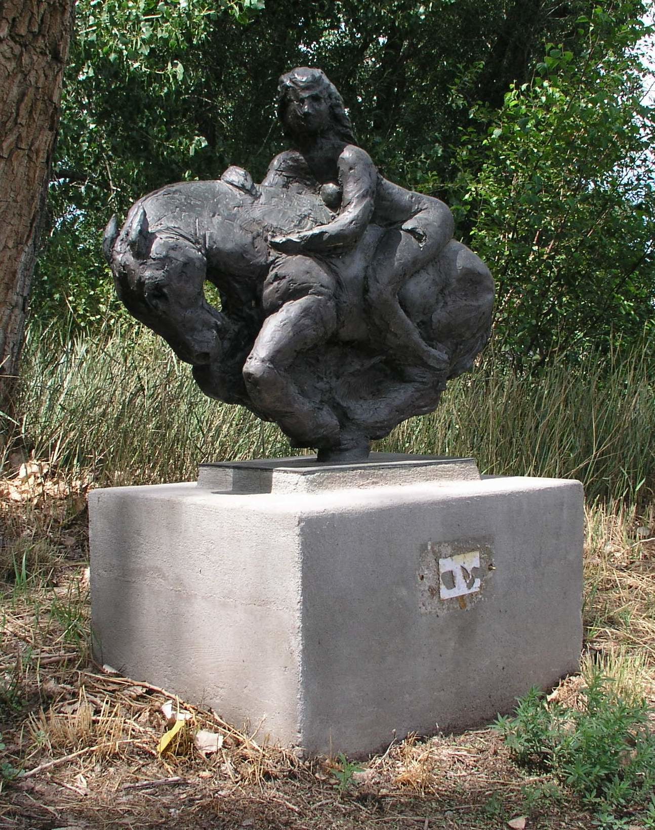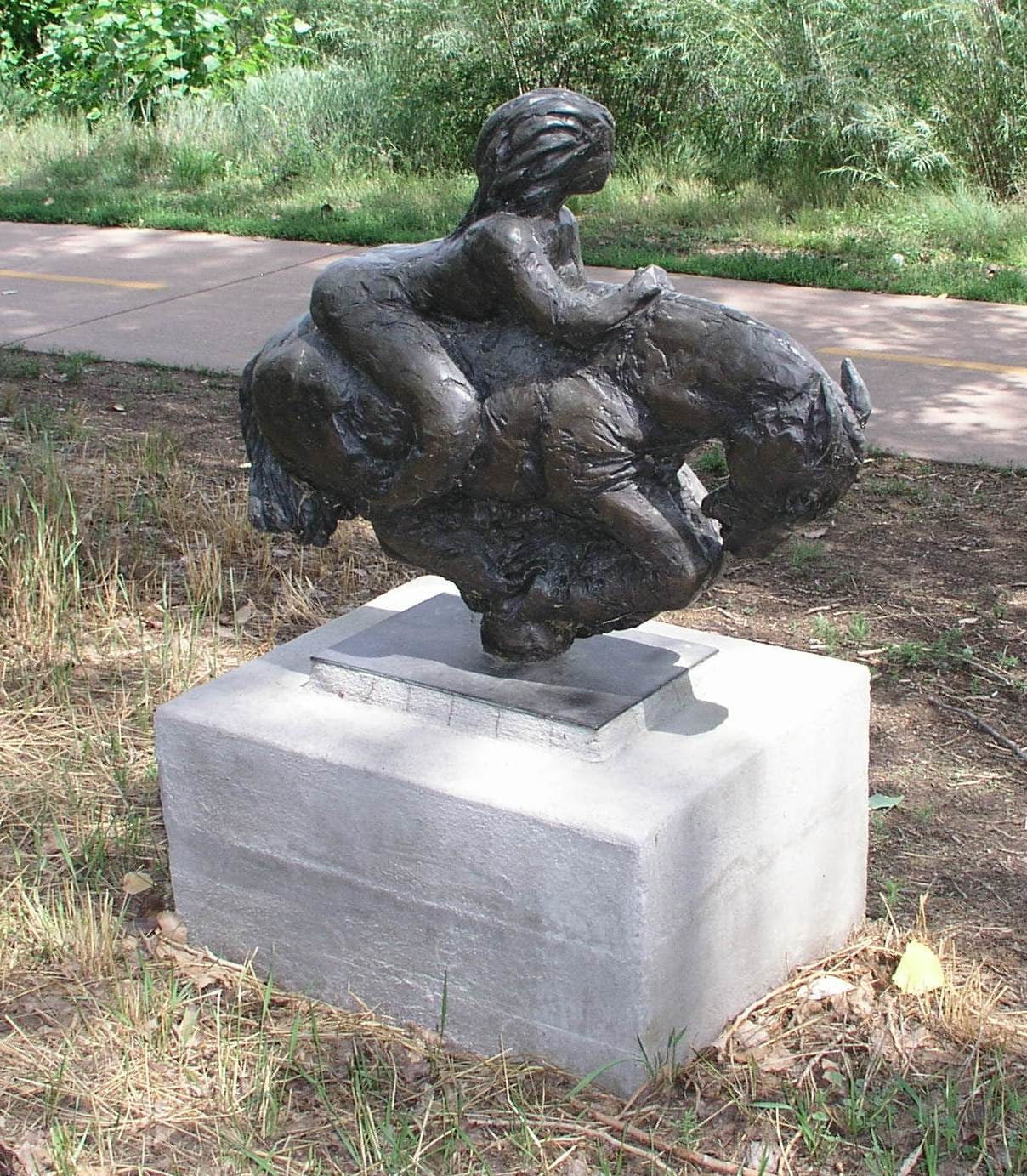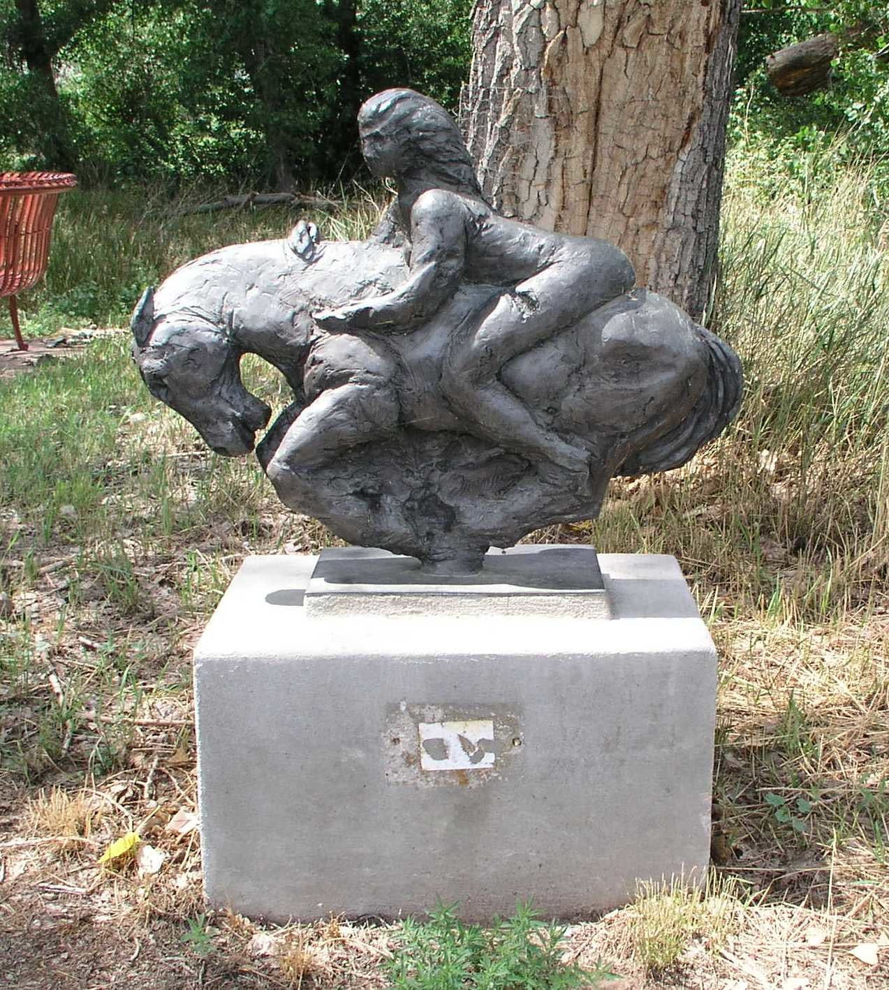 "Woman Riding Horse" by Andrew Trunfio, 1998; bronze; slightly stylized figure of nude woman riding a racing horse bareback; surface is slightly rough, with gouges and pits; hooves of horse curled under body, and rest on round piece; base is rectangular piece of bronze, which is attached to large, rectangular poured concrete base.