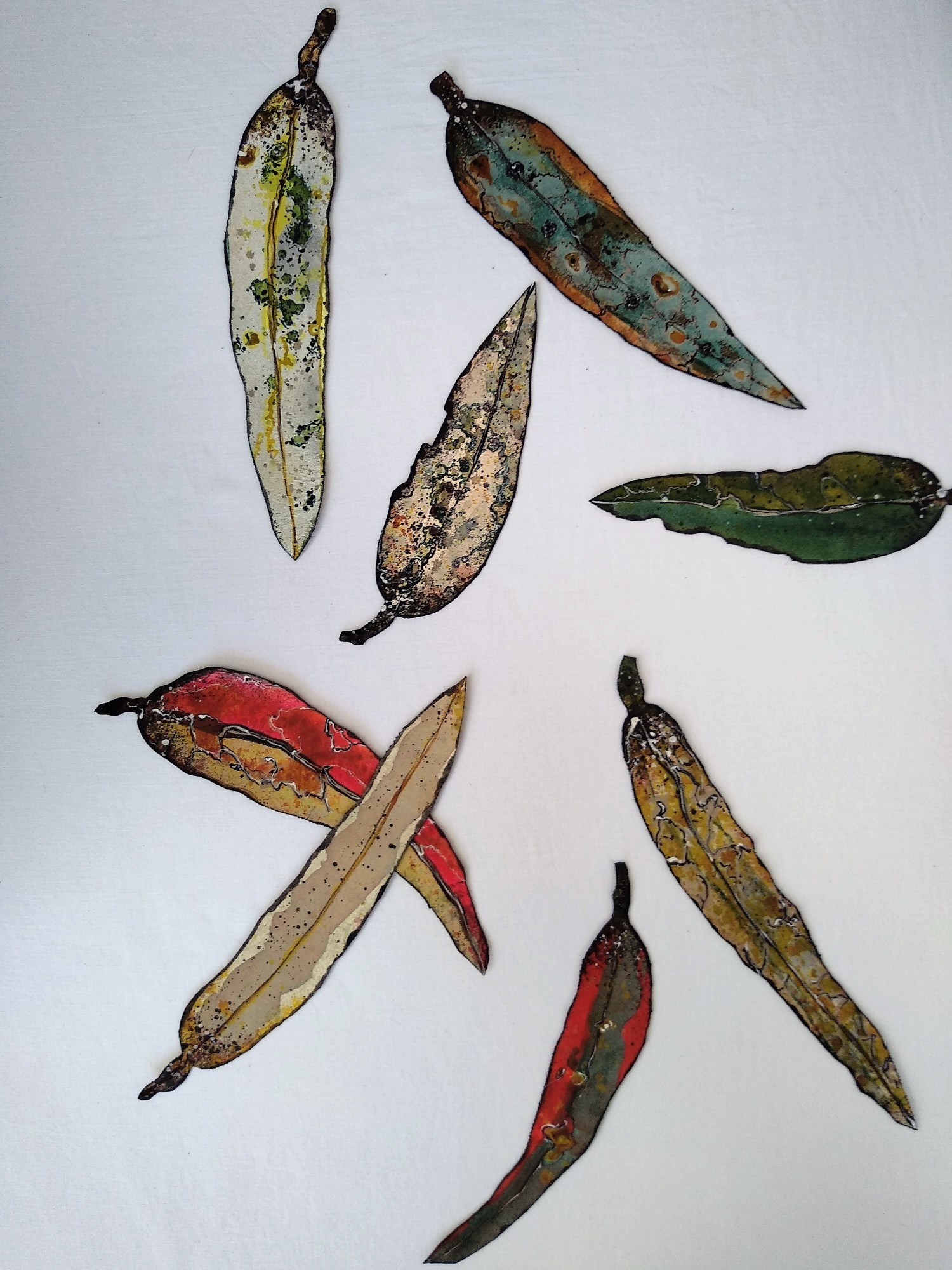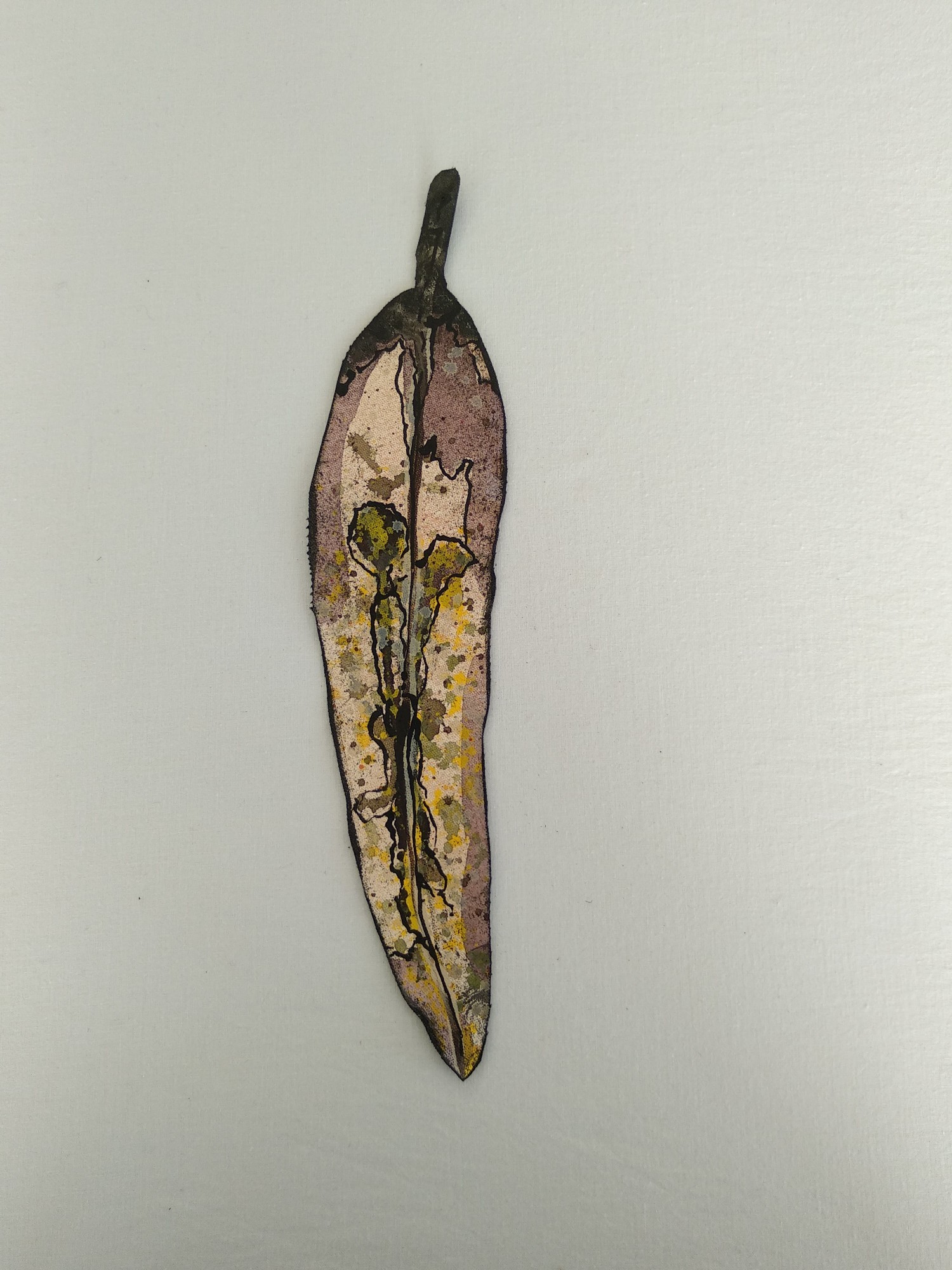 Form, surface and shadow are an integral part of my artworks. The leaves sit closely at the intersection between 2D and 3D, being cut canvas they are flat .. then they are hung on gallery pins, which holds them out from the wall, giving movement and shadow, reminiscent of the dappled forest.