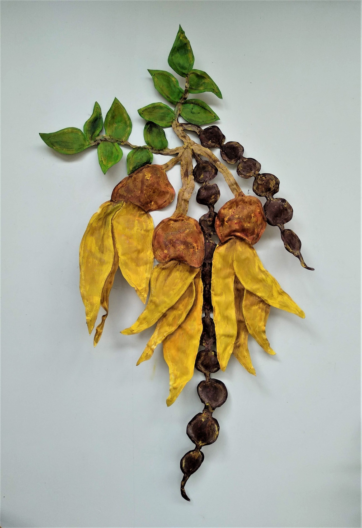 I have always loved the delicacy and colour of the Kowhai flowers, and the pods were some of the first that attracted me in my art practice, such fabulous shapes and tones. In this sculpture I have blended those colours and forms into one, I hope you enjoy it as much as I did making it.