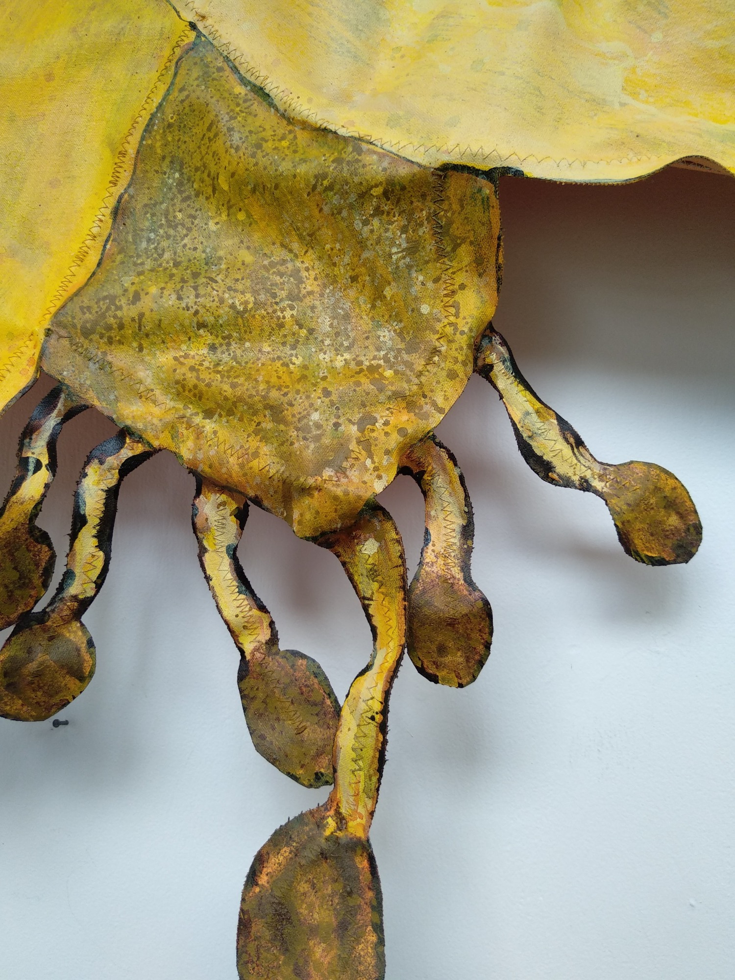 The new Canvas/Wire series comes from a desire to push the 2D boundary. These works sit closely at the intersection between 2D and 3D, being cut canvas it is flat .. then with wire and hanging points to hold it out from the wall, giving movement and shadow. Form, surface and shadow are an integral part of my artworks.
