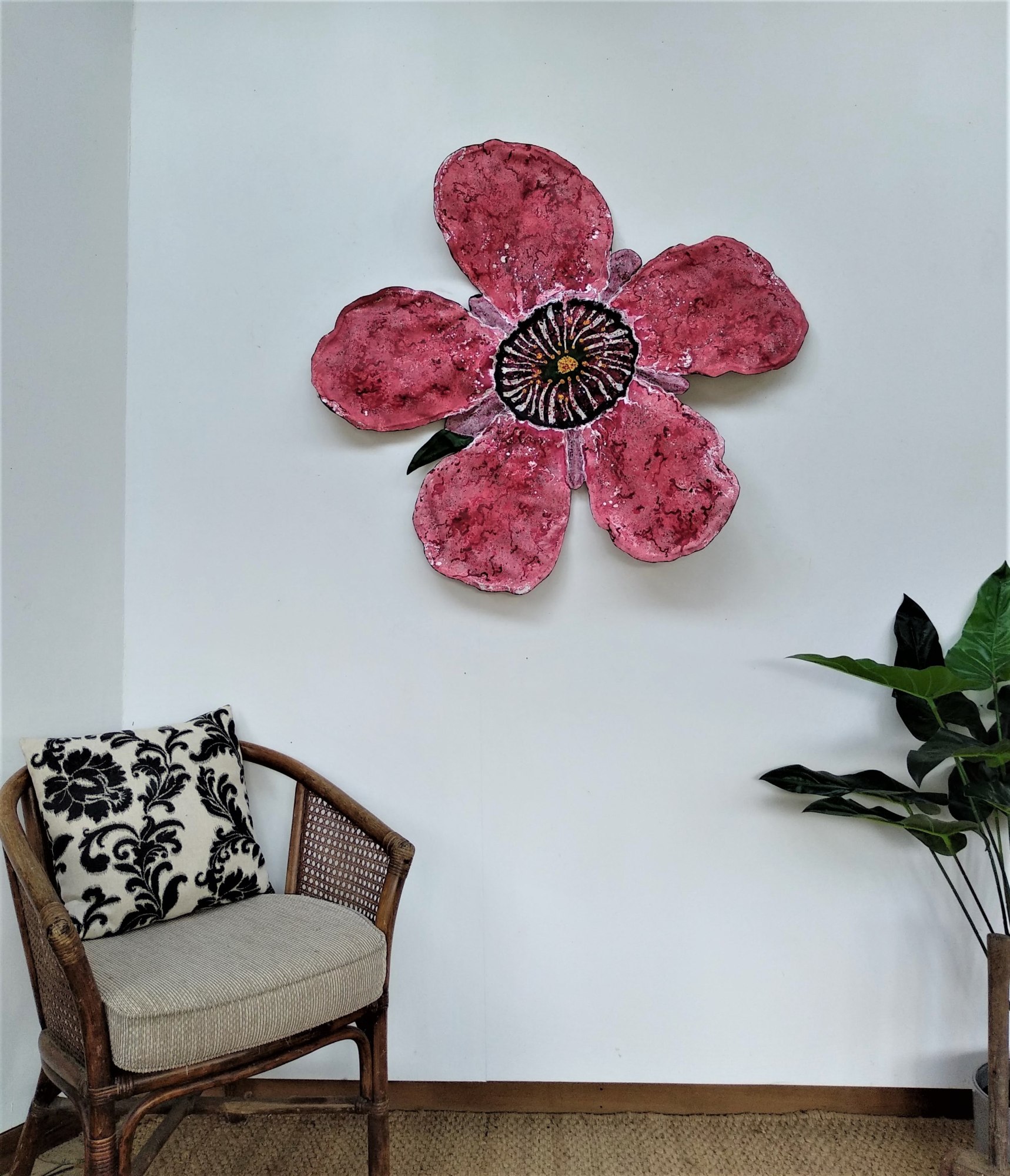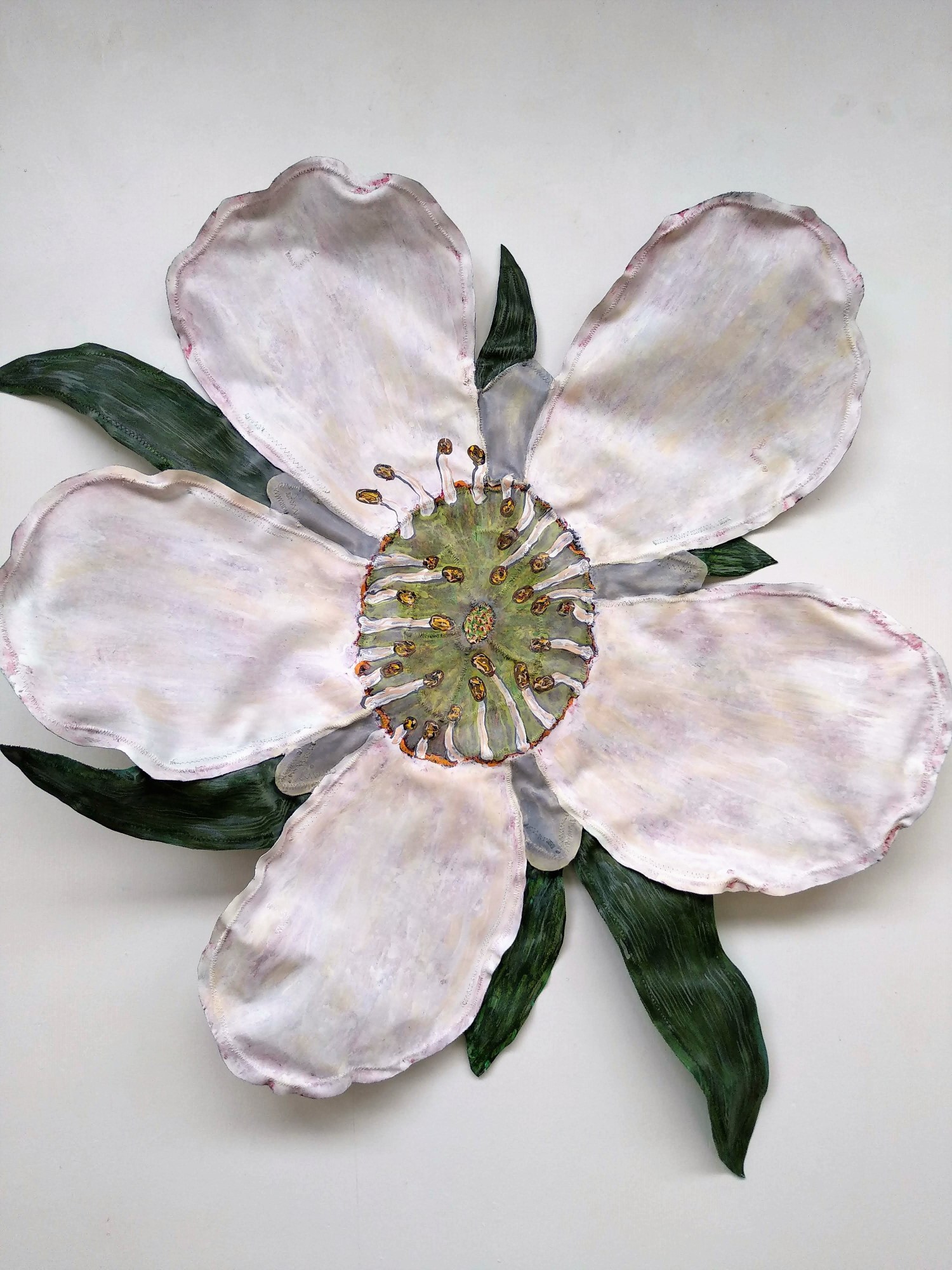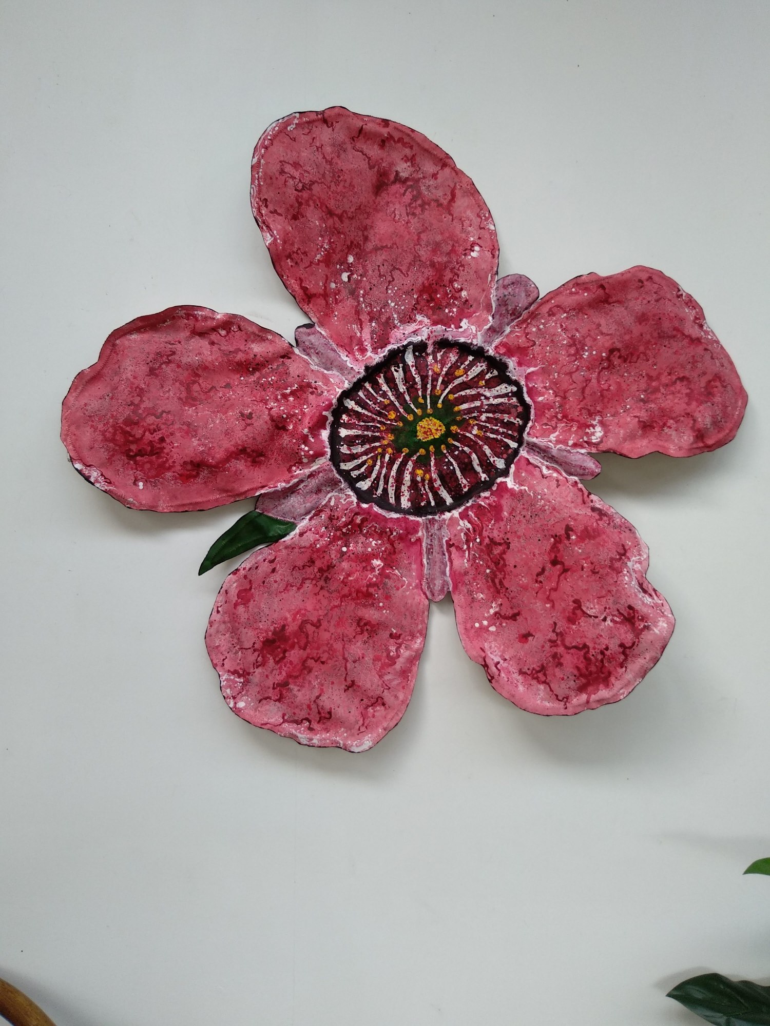 Manuka flowers are such bright happy things, not long lasting, and falling like snow in a hot New Zealand landscape. Often more white in colour, I have chosen to portray the pinker/redder variety. The form is simple and childlike.