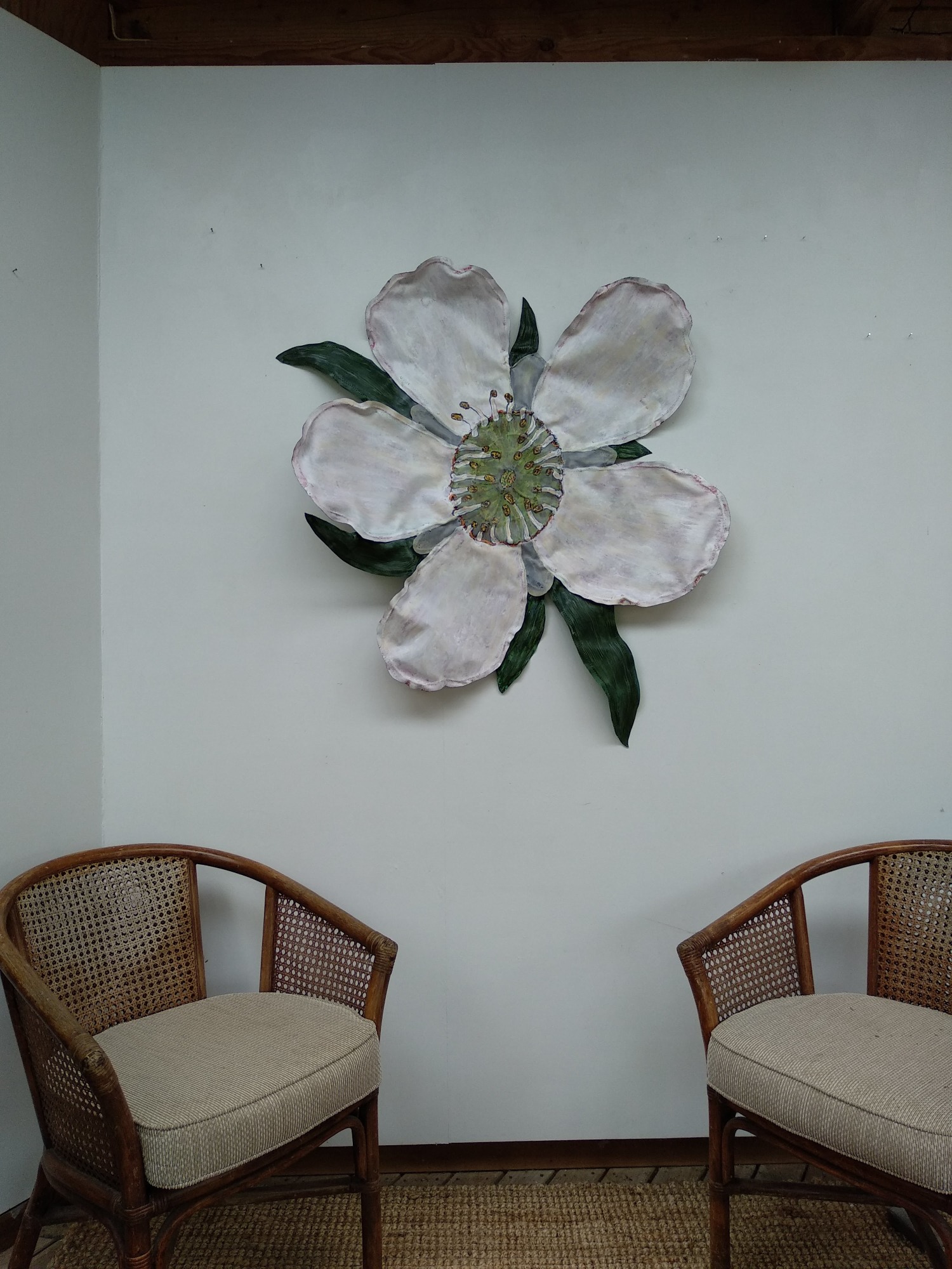 Manuka flowers are such bright happy things, not long lasting, and falling like snow in a hot New Zealand landscape. Often more white in colour, I have chosen to portray the pinker/redder variety. The form is simple and childlike.
