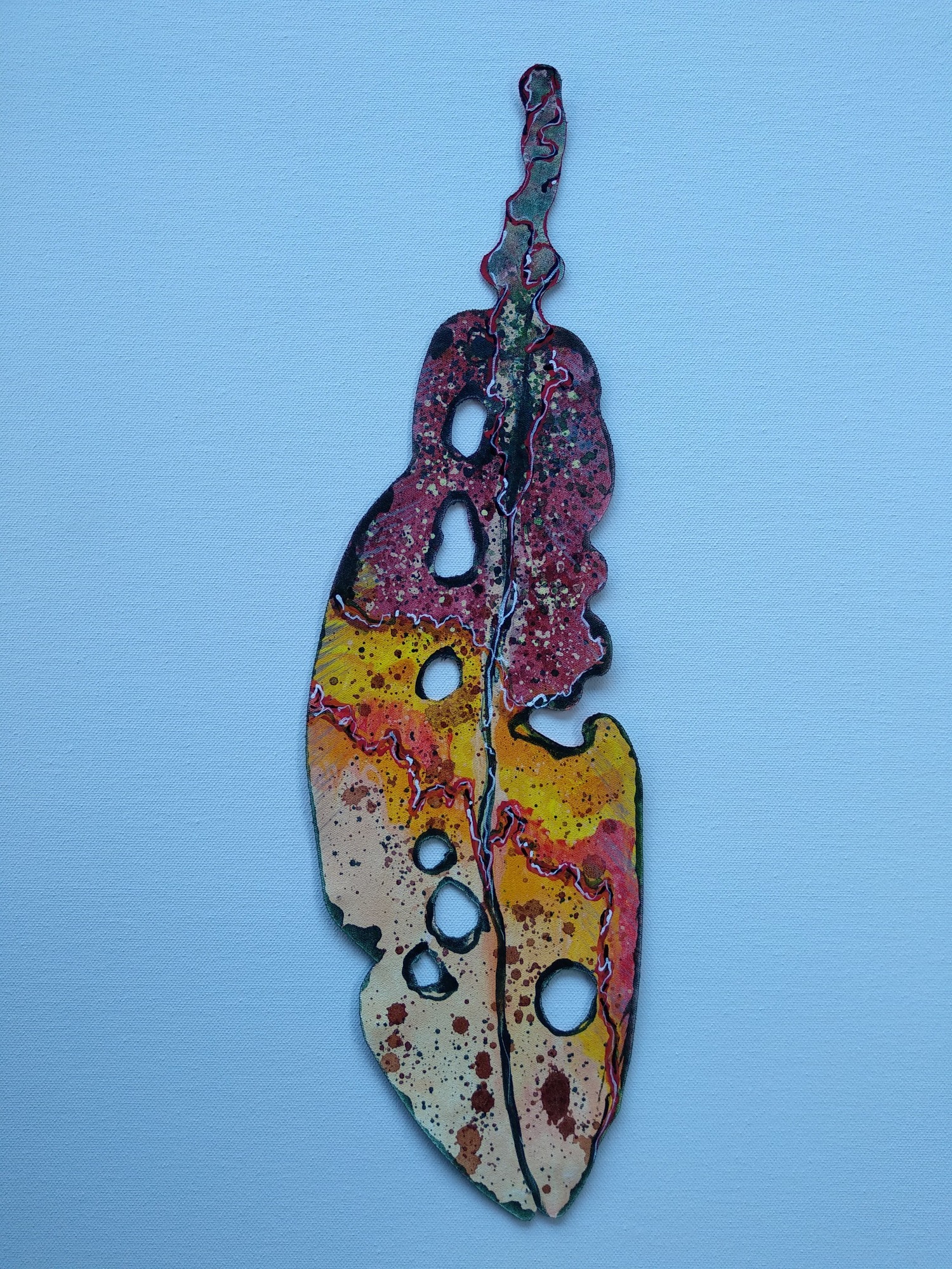 Form, surface and shadow are an integral part of my artworks. The leaves sit closely at the intersection between 2D and 3D, being cut canvas they are flat .. then they are hung on gallery pins, which holds them out from the wall, giving movement and shadow, reminiscent of the dappled forest.