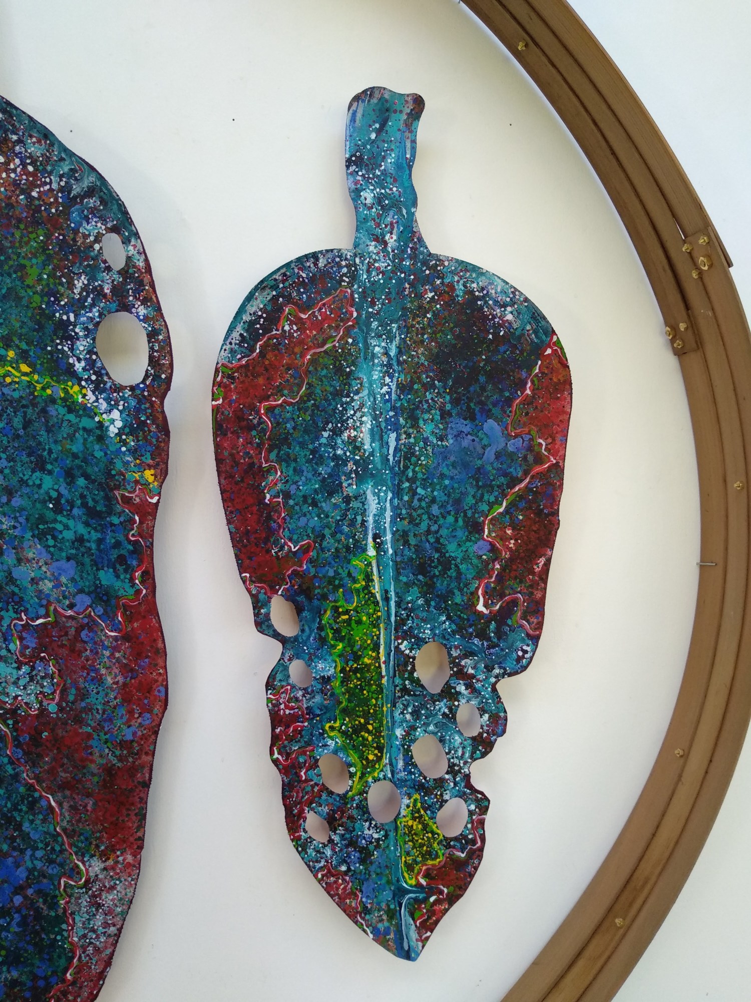 Form, surface and shadow are an integral part of my artworks. The leaves sit closely at the intersection between 2D and 3D, being cut canvas they are flat .. then they are hung on gallery pins, which holds them out from the wall, giving movement and shadow, reminiscent of the dappled forest.