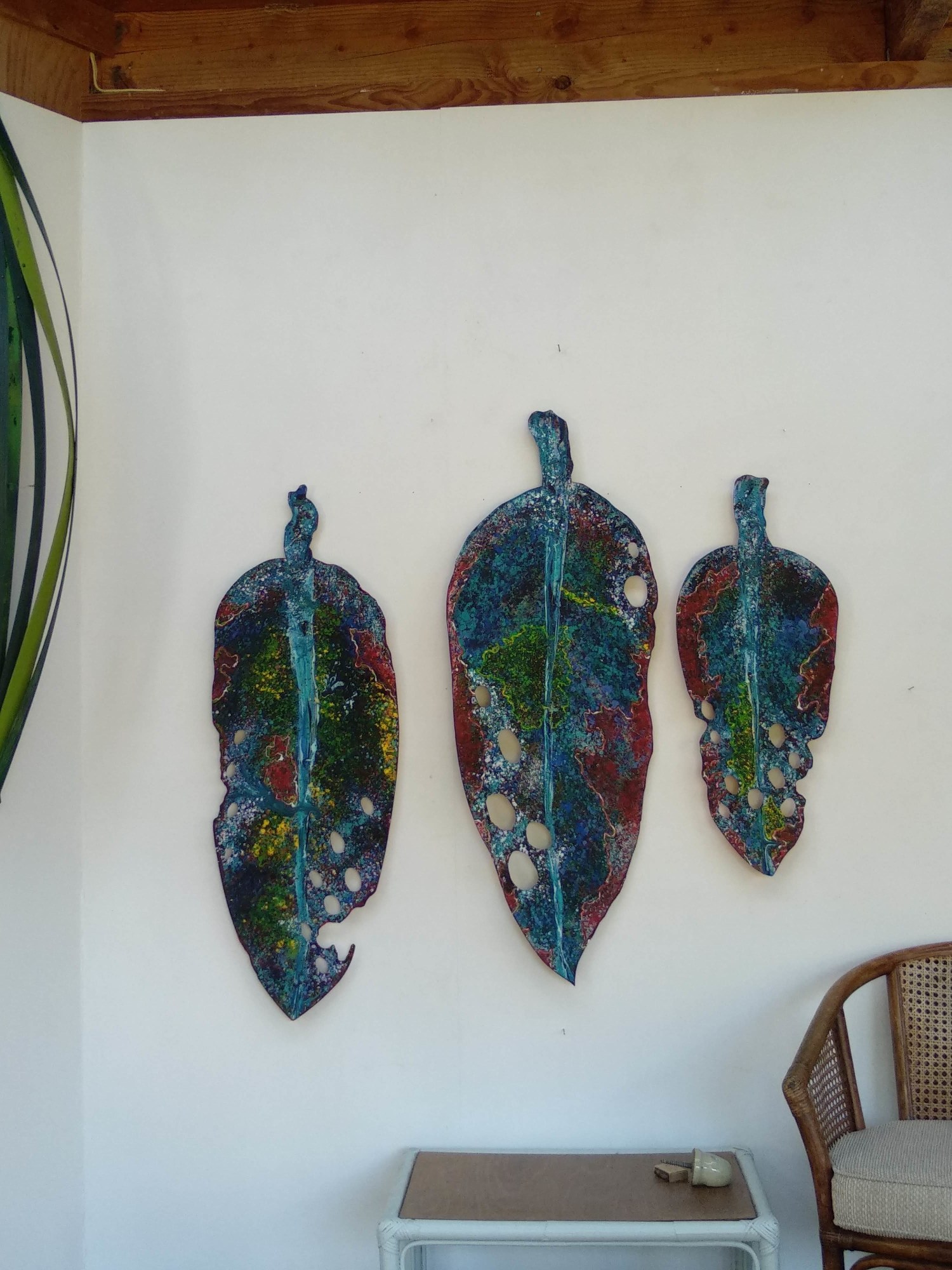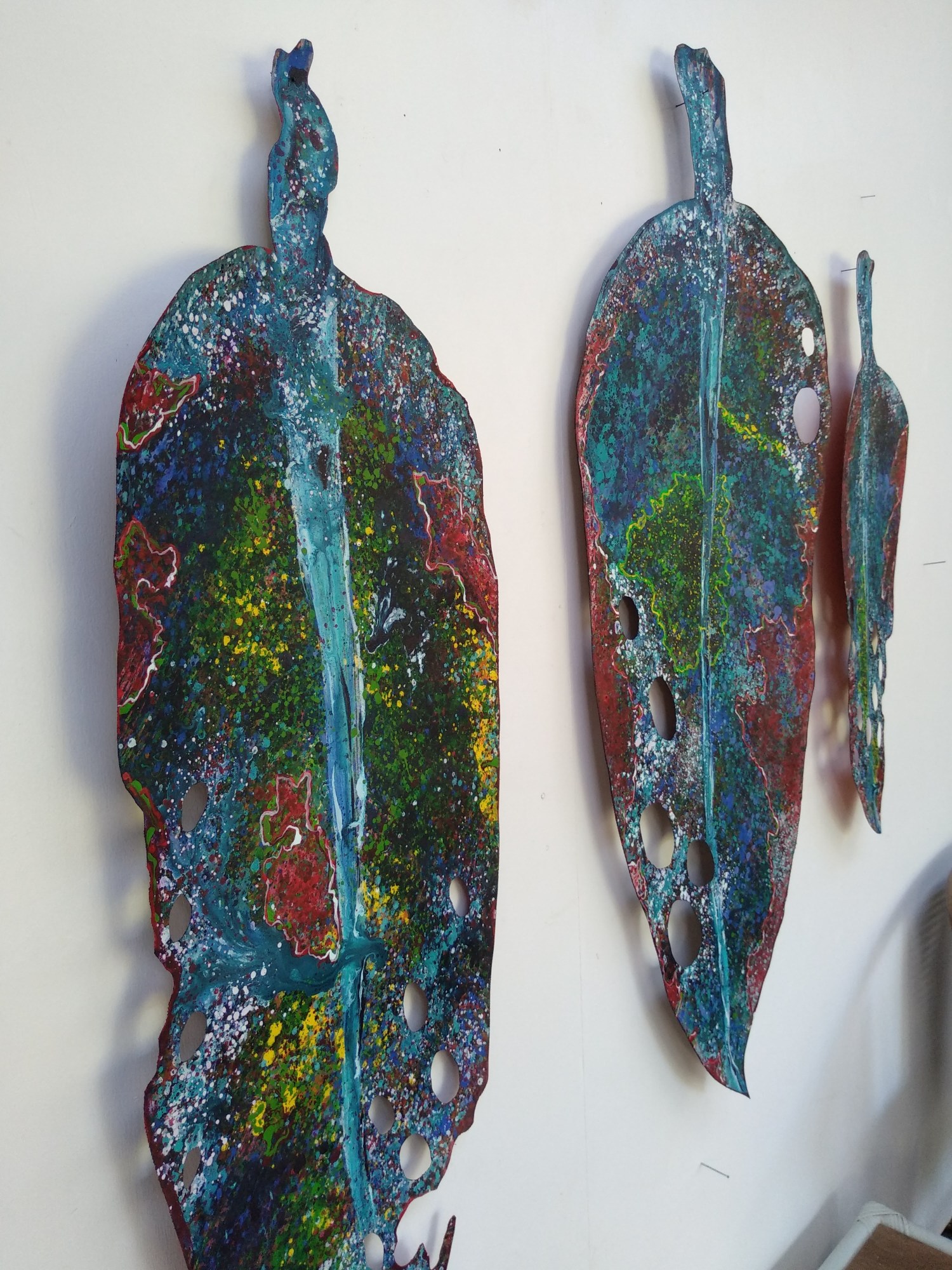 Form, surface and shadow are an integral part of my artworks. The leaves sit closely at the intersection between 2D and 3D, being cut canvas they are flat .. then they are hung on gallery pins, which holds them out from the wall, giving movement and shadow, reminiscent of the dappled forest.