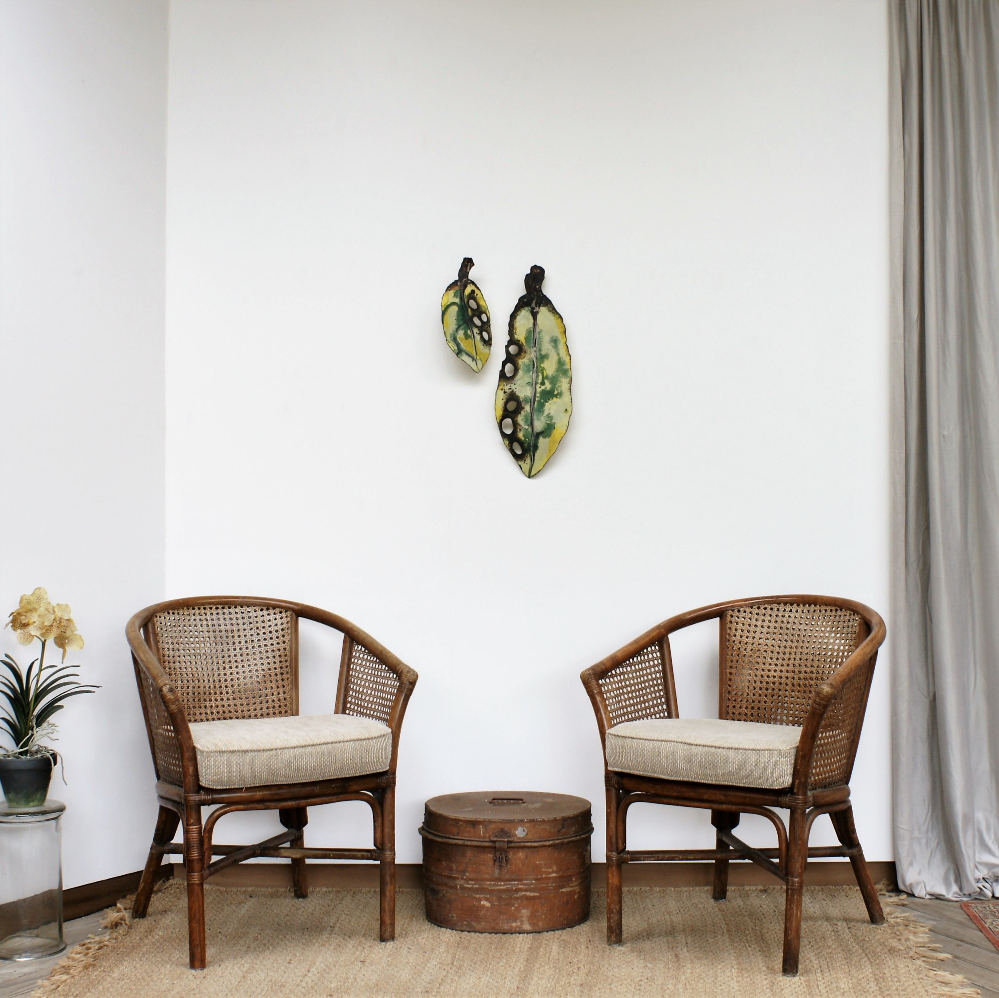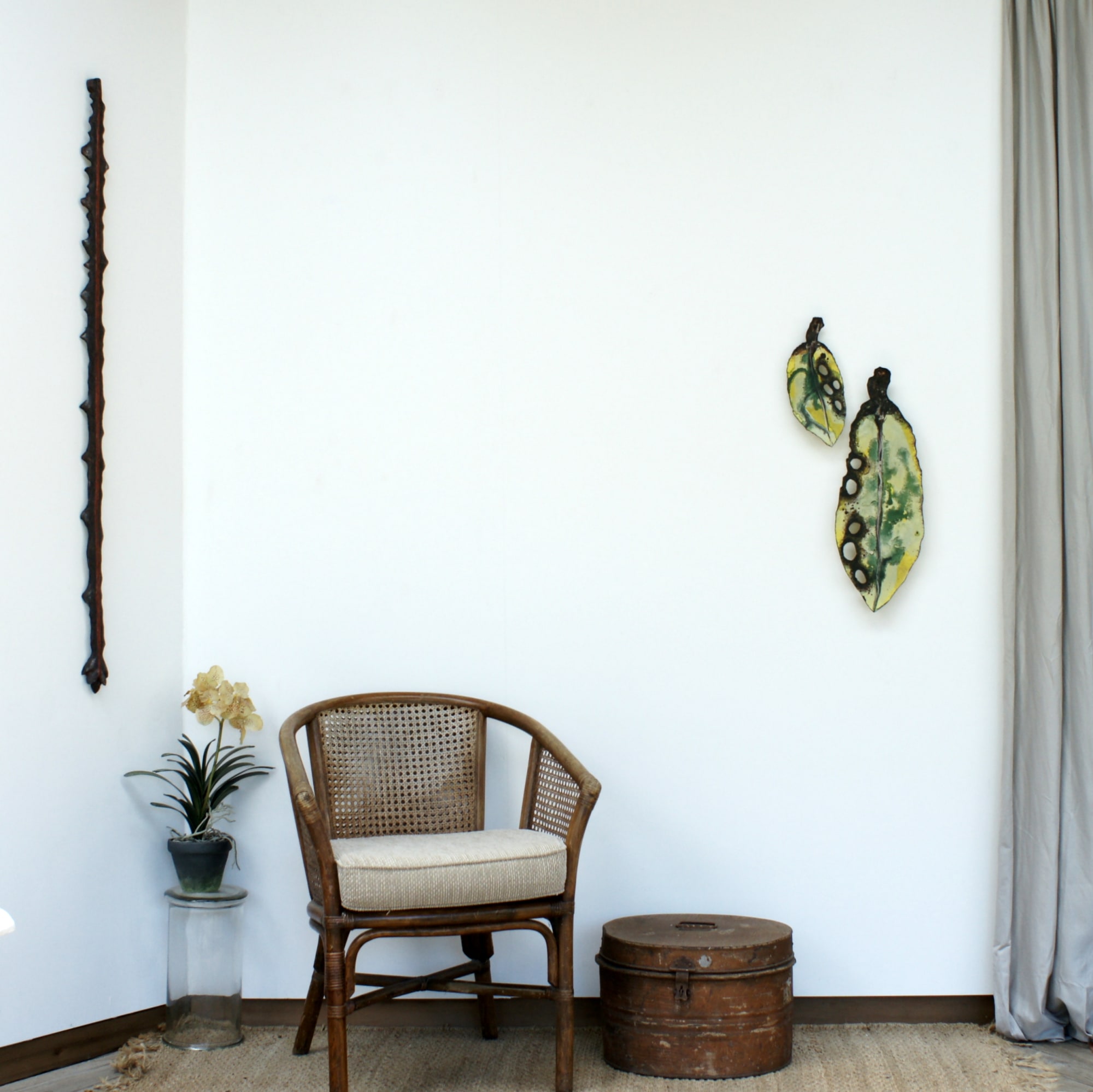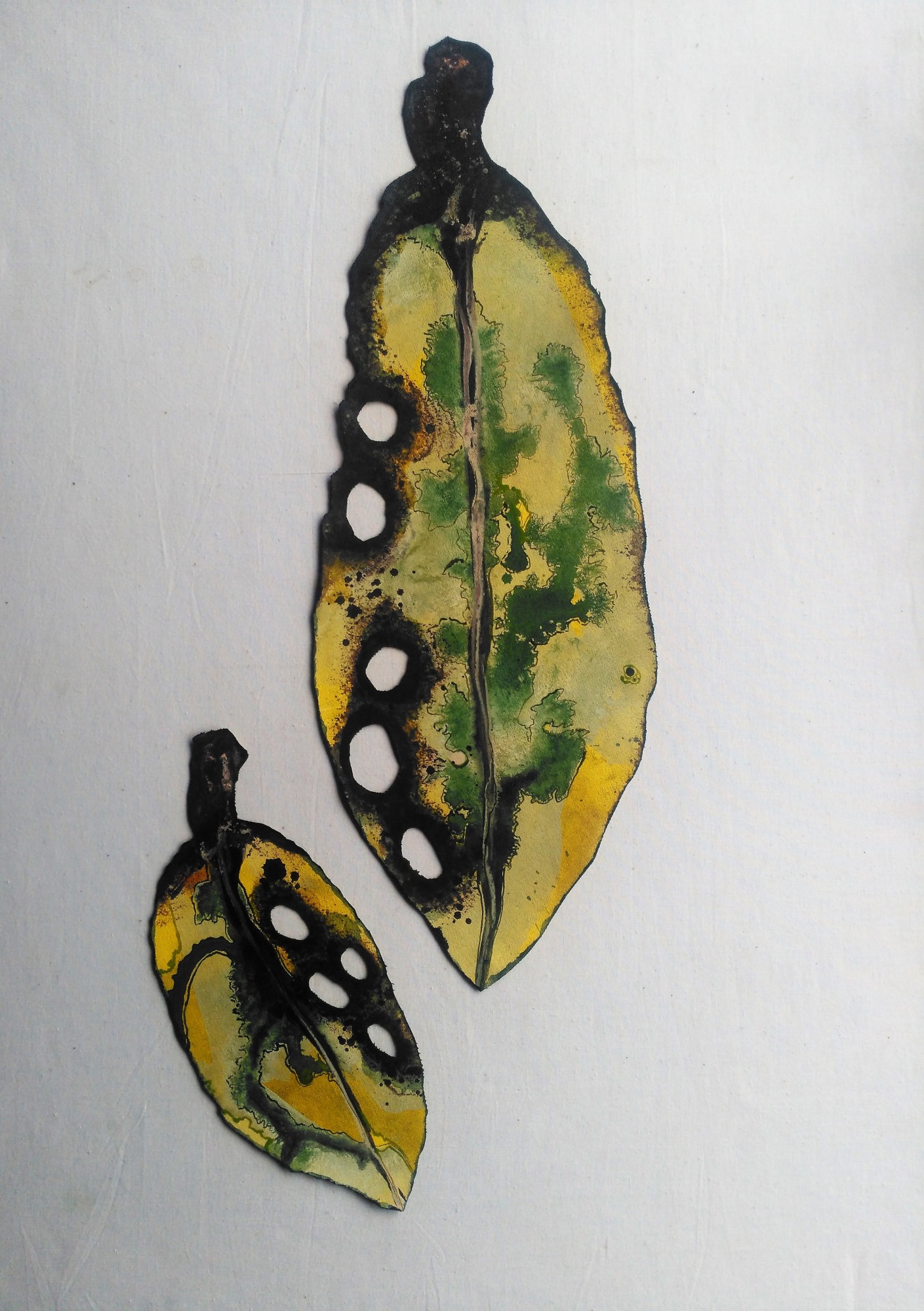 Form, surface and shadow are an integral part of my artworks. The leaves sit closely at the intersection between 2D and 3D, being cut canvas they are flat .. then they are hung on gallery pins, which holds them out from the wall, giving movement and shadow, reminiscent of the dappled forest.