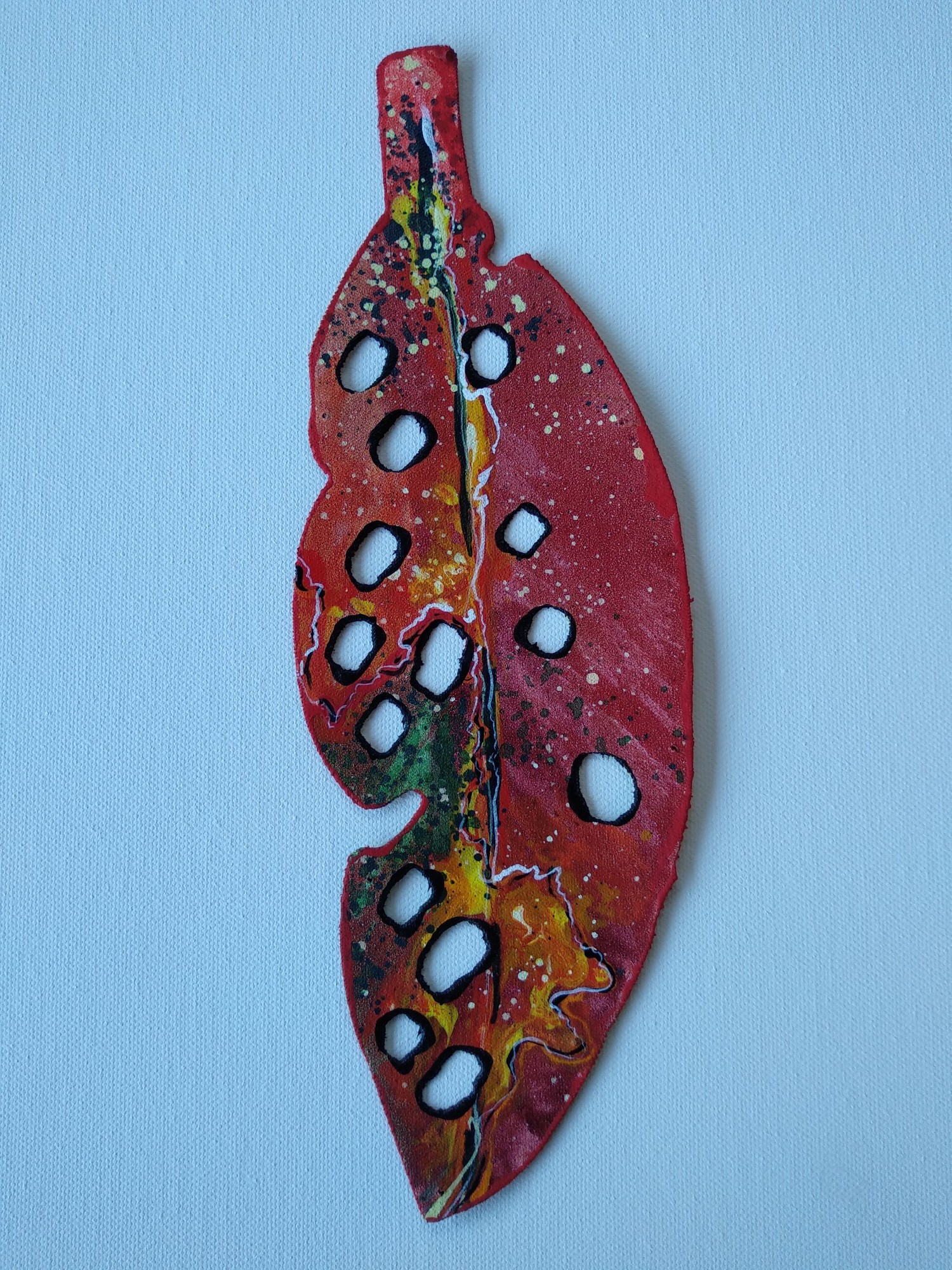 Form, surface and shadow are an integral part of my artworks. The leaves sit closely at the intersection between 2D and 3D, being cut canvas they are flat .. then they are hung on gallery pins, which holds them out from the wall, giving movement and shadow, reminiscent of the dappled forest.
