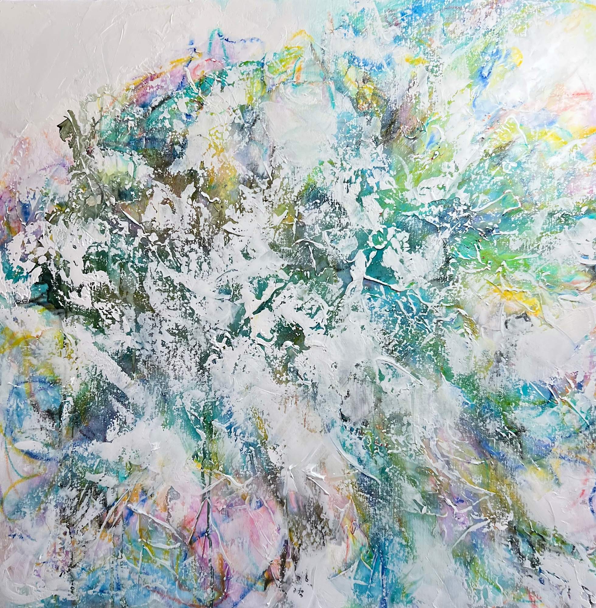 Luminous Swells is a piece that invites you to enter a vibrant world of color and motion, where energy and emotion ebb and flow in an abstract dance. This painting pulses with dynamic splashes and strokes, predominantly in shades of blue and green, accented by subtle glimpses of yellow and pink. White textures layer across the composition, creating a rhythm that both grounds and propels the movement, adding a sense of depth that feels alive and expansive.