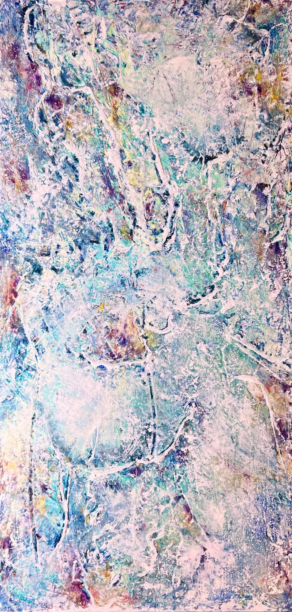 “Takiwātanga” unfolds as a delicate balance between presence and mystery, inviting the viewer into a space where color and texture converge in quiet dialogue. Measured and intentional, the cool blues and teals wash across the surface like drifting currents, their layered depths punctuated by subtle strokes of white that shimmer with a luminous calm. Beneath this tranquil exterior, soft interjections of muted reds and yellows appear like fleeting whispers—warm flashes that gently disrupt and enliven the composition.