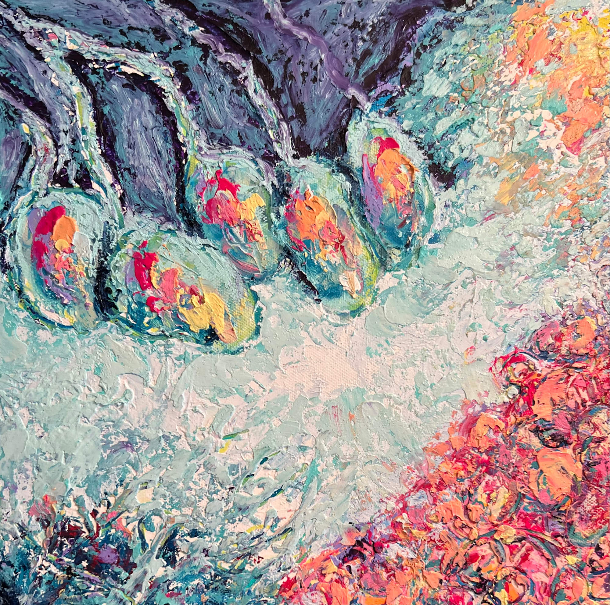 *Through Turquoise Waves*, layers thick paint in shapes of blue, green, and turquoise with sharp accents of red, orange, and purple. The warm, dense colors in the corner contrast with cooler tones, creating movement and depth. The texture emphasizes the energy and flow I aimed to capture.