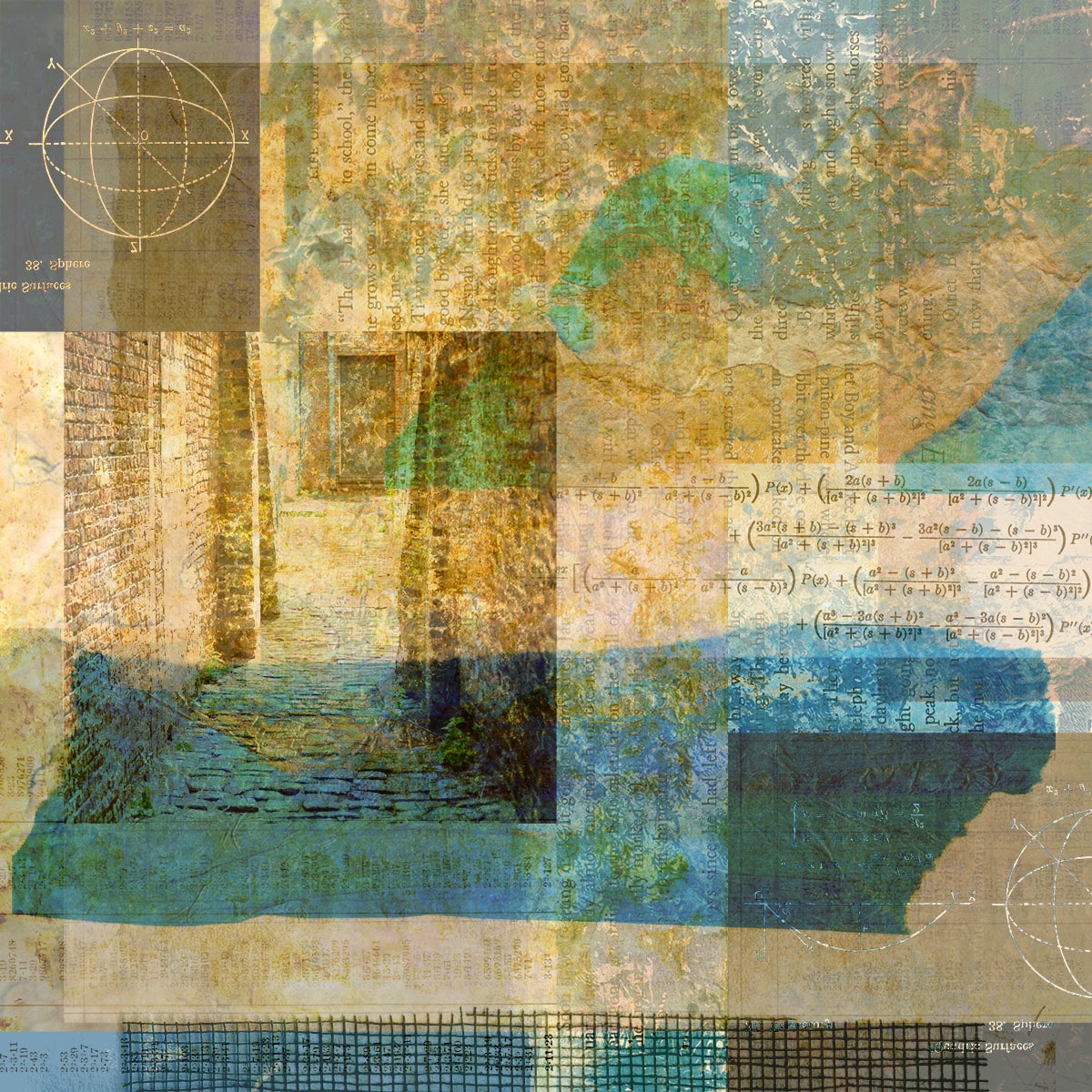 This mysterious alley in Bruges, Belgium, is enhanced by collages, math notation, and textures from printmaking.