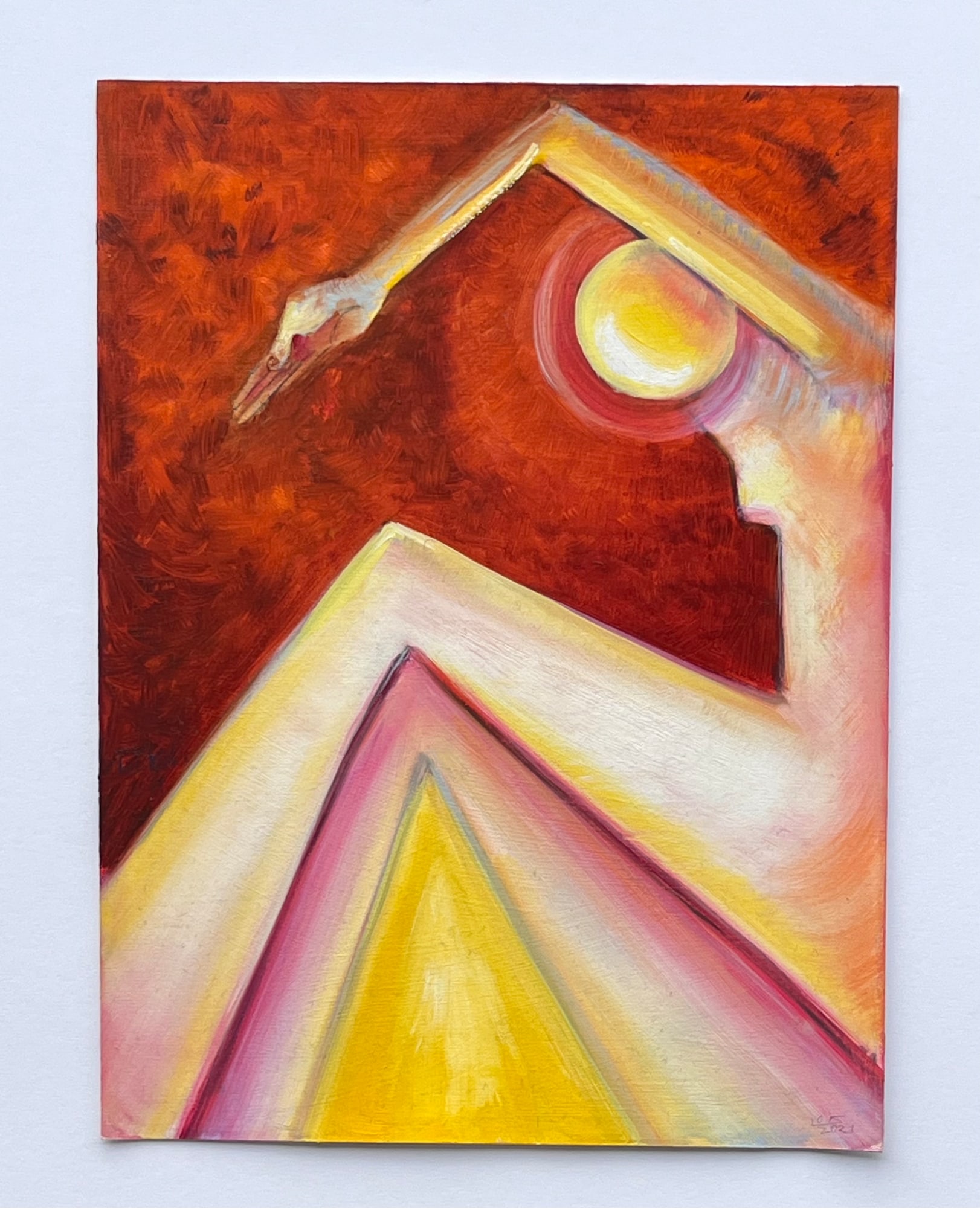 An angular human figure with hues of beige, white, yellow, red, orange, and black