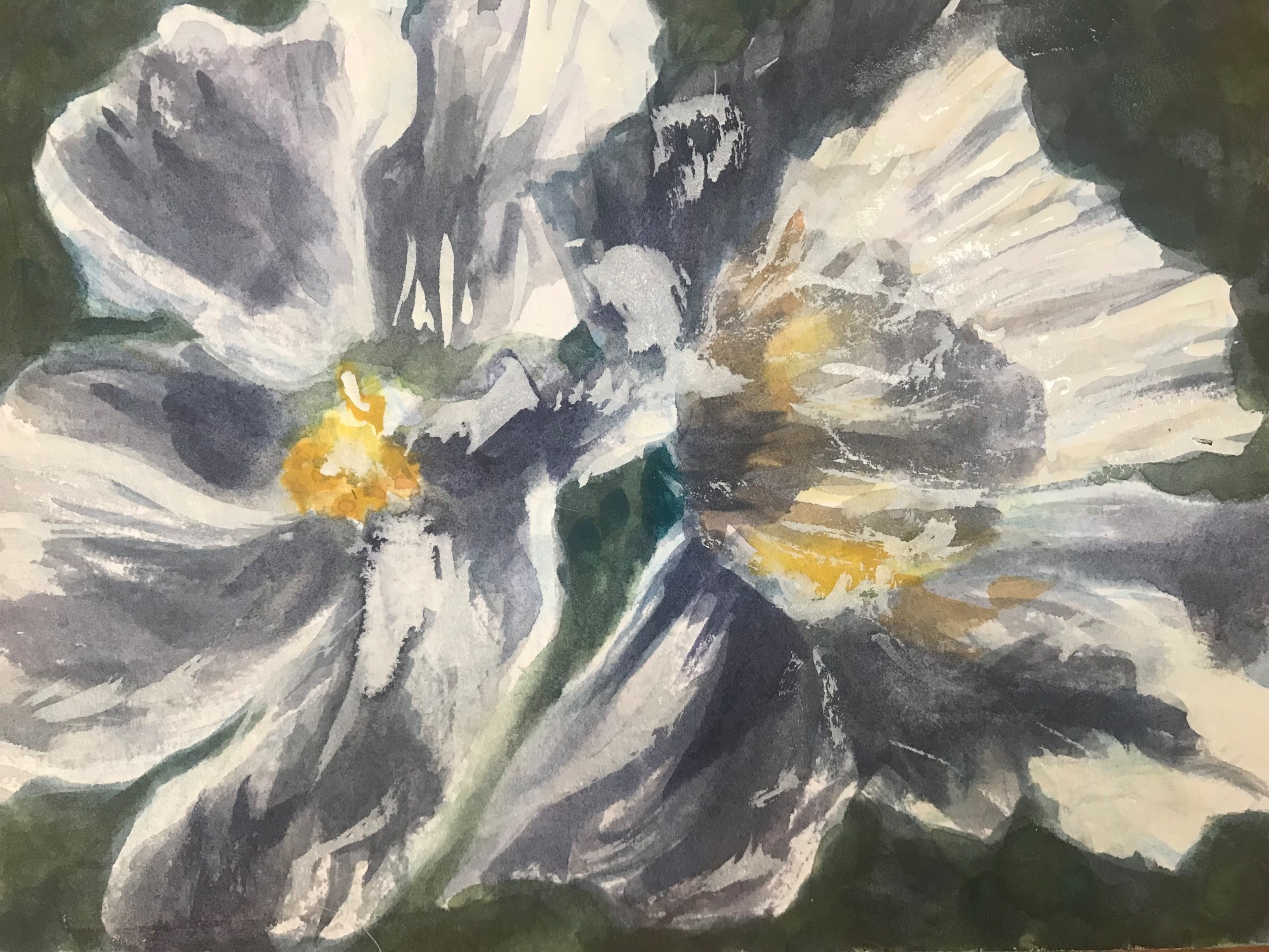 Watercolor captures the transparency of the Matilija petals at sunset with subtle oranges and Prussian blue shadows that spill over the edge of the thick watercolor paper.