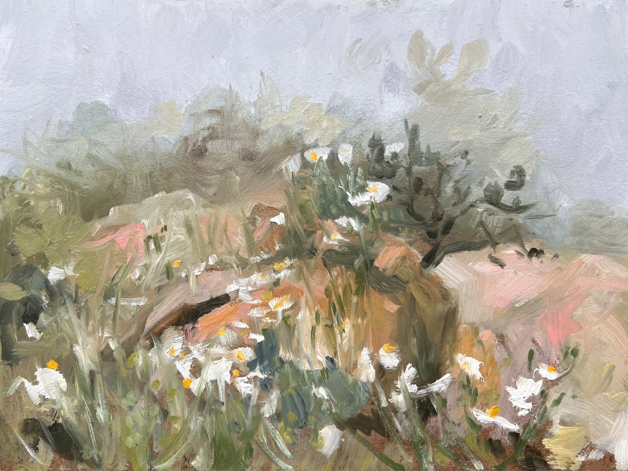 The marine layer mist hovers over the California landscape of the pink Santa Monica Mountains and soft whites of the blooming Matilija poppies. It gives one the feeling of being immersed amongst the grove and captures the lightness and air that makes these native California flowers magically float . These native to the region giant "fried egg" flowers suddenly bloom in the Santa Monica Mountains every May. Painted en plein air.