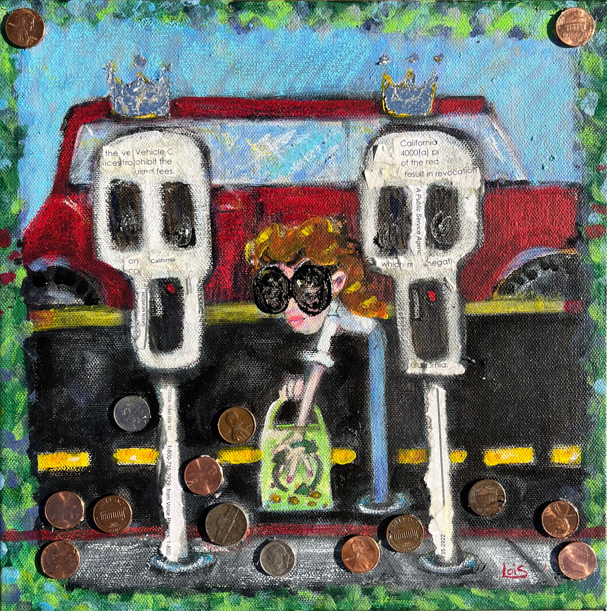 The ParKing series pokes at the car-centric landscape of LA, playfully personifying the LADOT meters packed in across the city that occupy pedestrian sidewalk space. The ParKing is both spirited and sinister, surreal but hyperreal. The ParKing reminds the audience of the meters and pay stations that dominate this overpopulated cityscape, and take priority over the folks that inhabit it. Despite the grim picture of it all, the ParKing series contains the Angeleno spirit of creation: erecting art from struggle. The series uses multimedia material including recycled cue cards, cardboard stripes, colored pencils, and loose change.