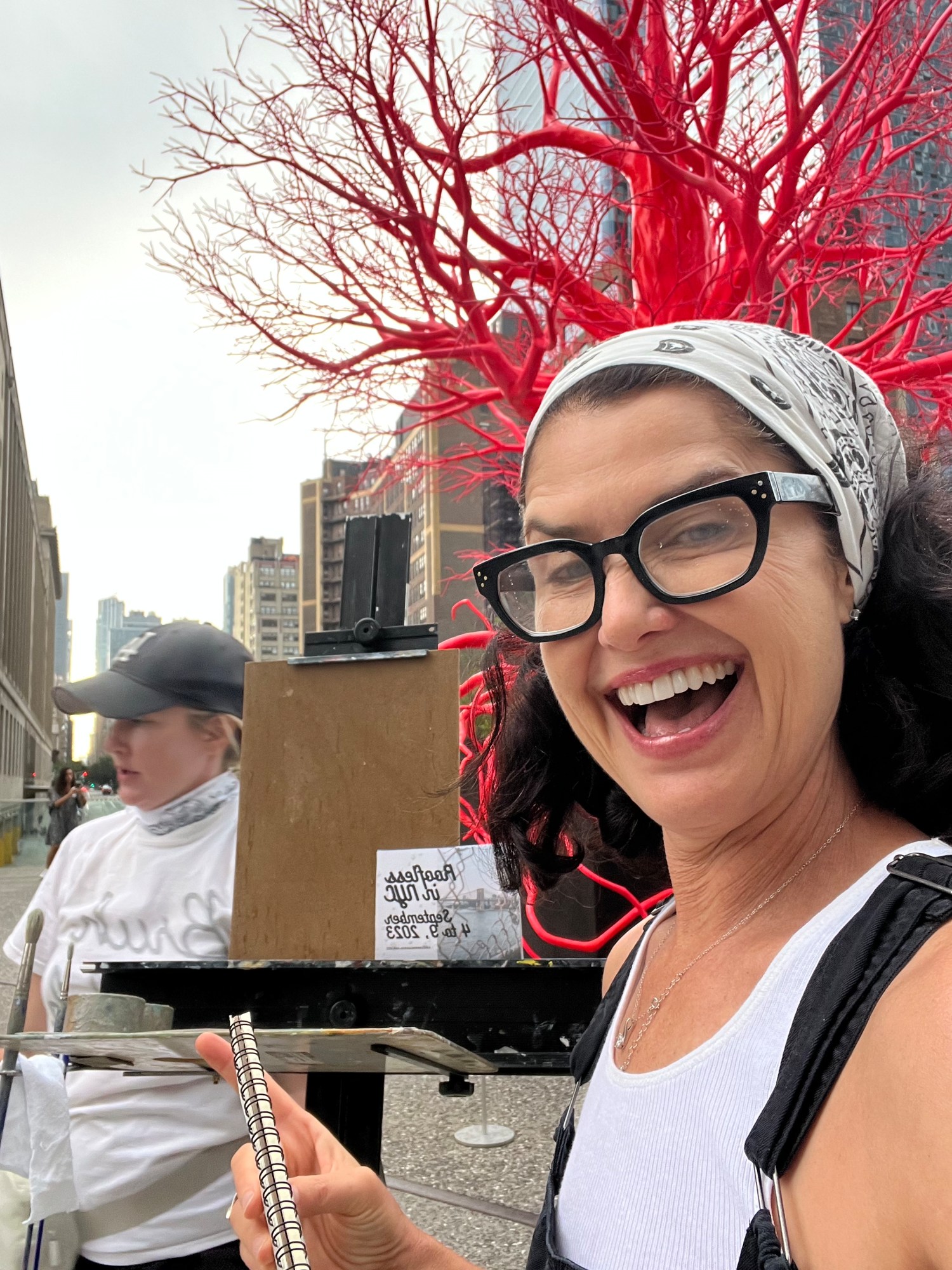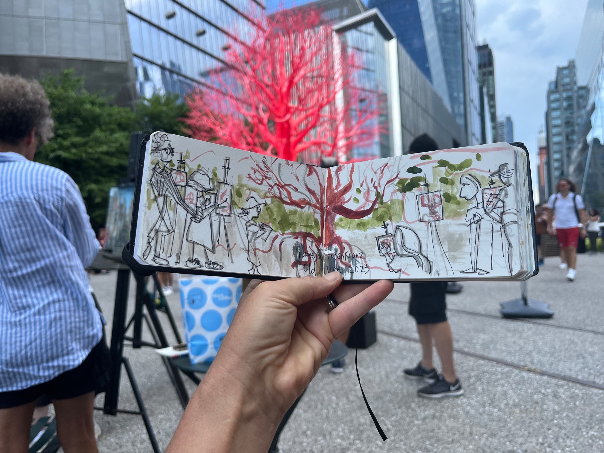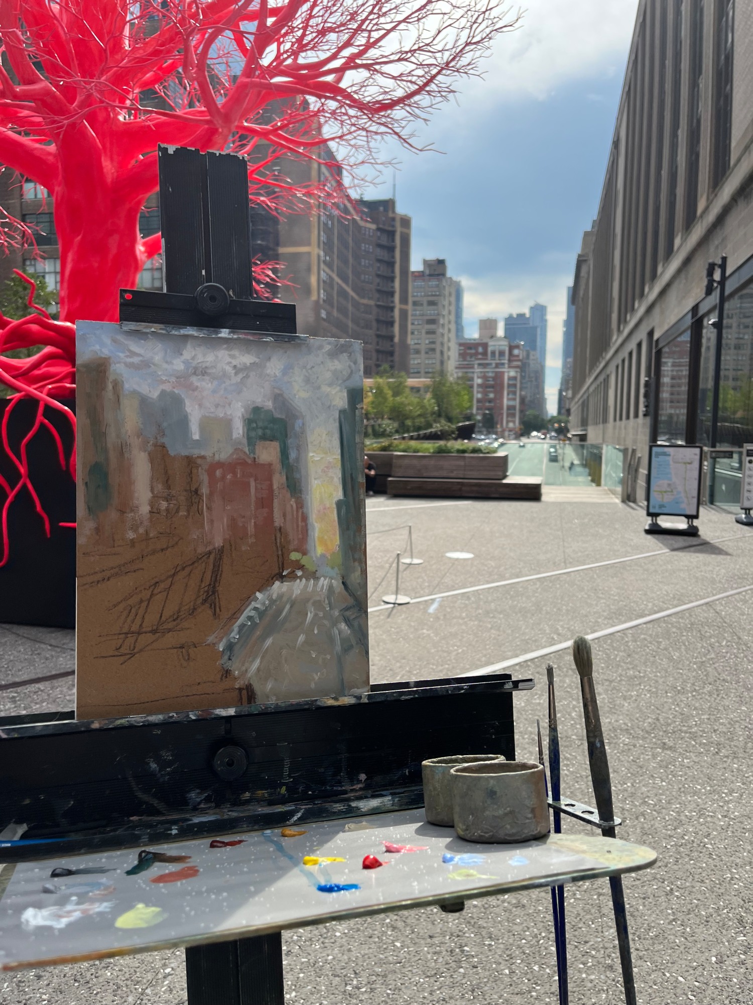 A painting of the view on the Highline in New York City including public art sculpture.