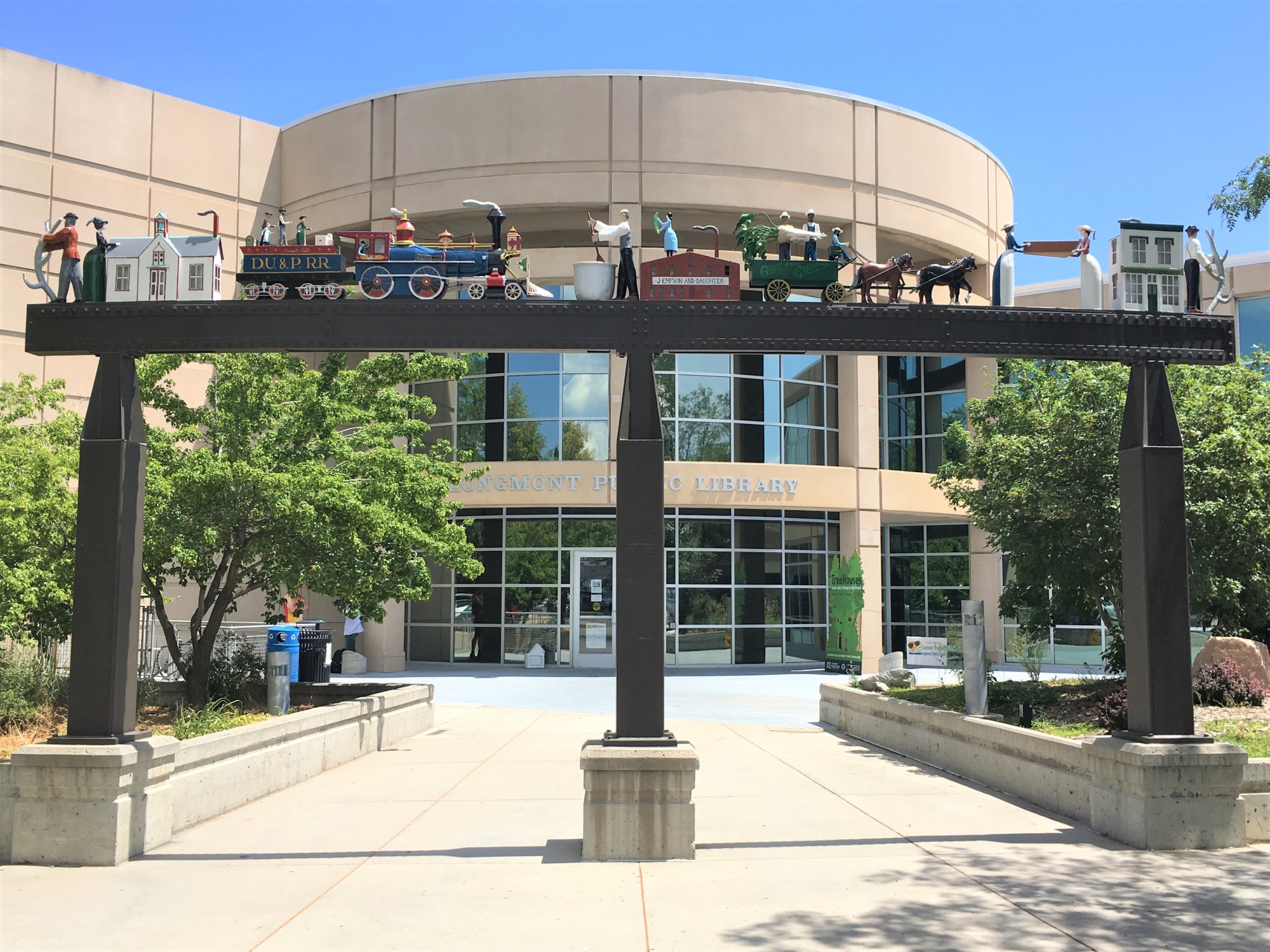 Greenamyer's portal of painted steel commemorates the founding people and events of the City of Longmont. Located at the entrance to the Public Library.