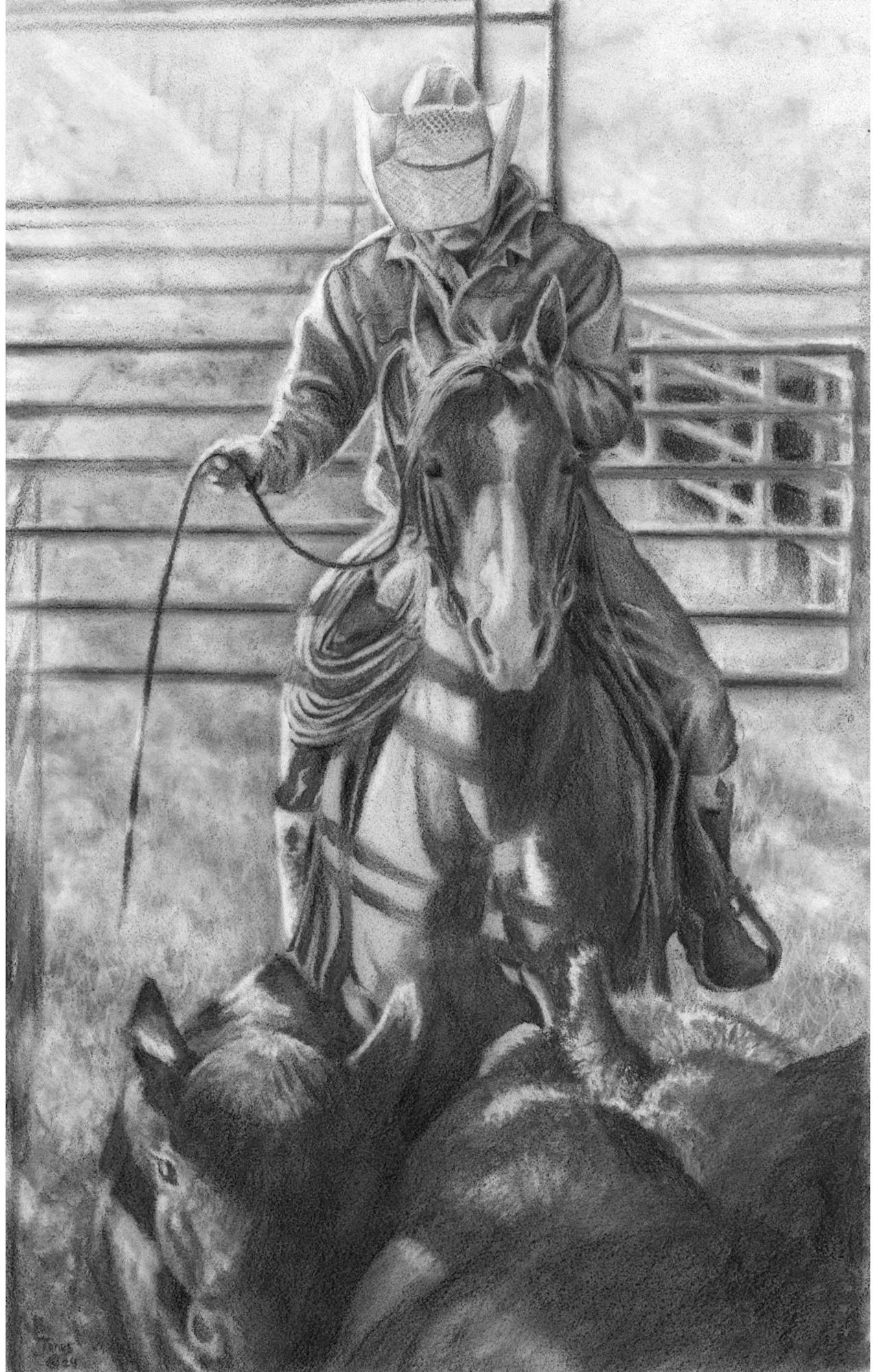 Up The Alley by Lori Jones  Image: My oldest Son Russell, pushing calves up the alley to load out, September 2023