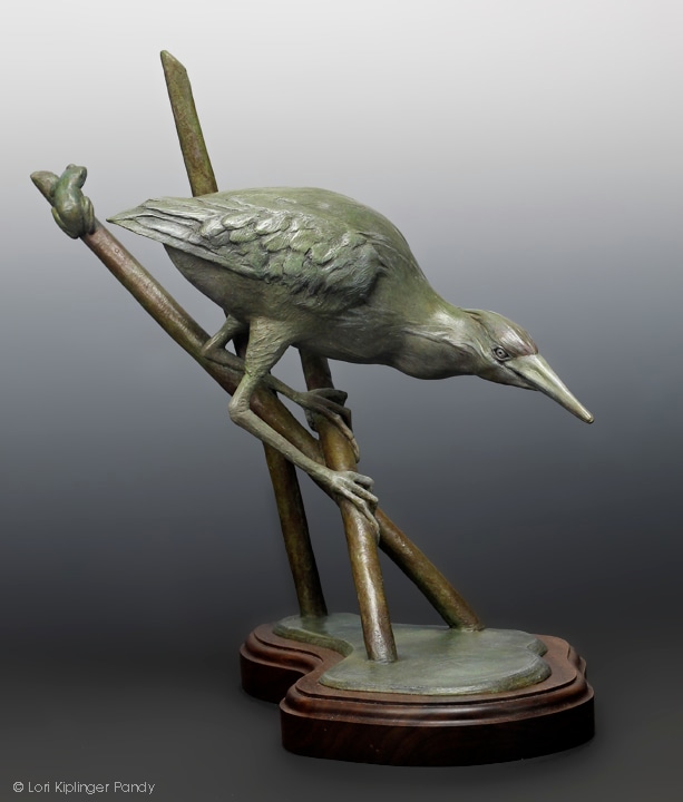 This sculpture is of a Least Bittern, smallest of the herons in the United States and a shore bird perched upon reeds. This is their common practice for feeding. These little birds are slow-moving and rather than wading like larger herons they take advantage of their smaller size by hiding among the grasses and reeds and perching motionless to hunt with their spearlike bills. Its prey are small fish, insects, freshwater shrimp and frogs.