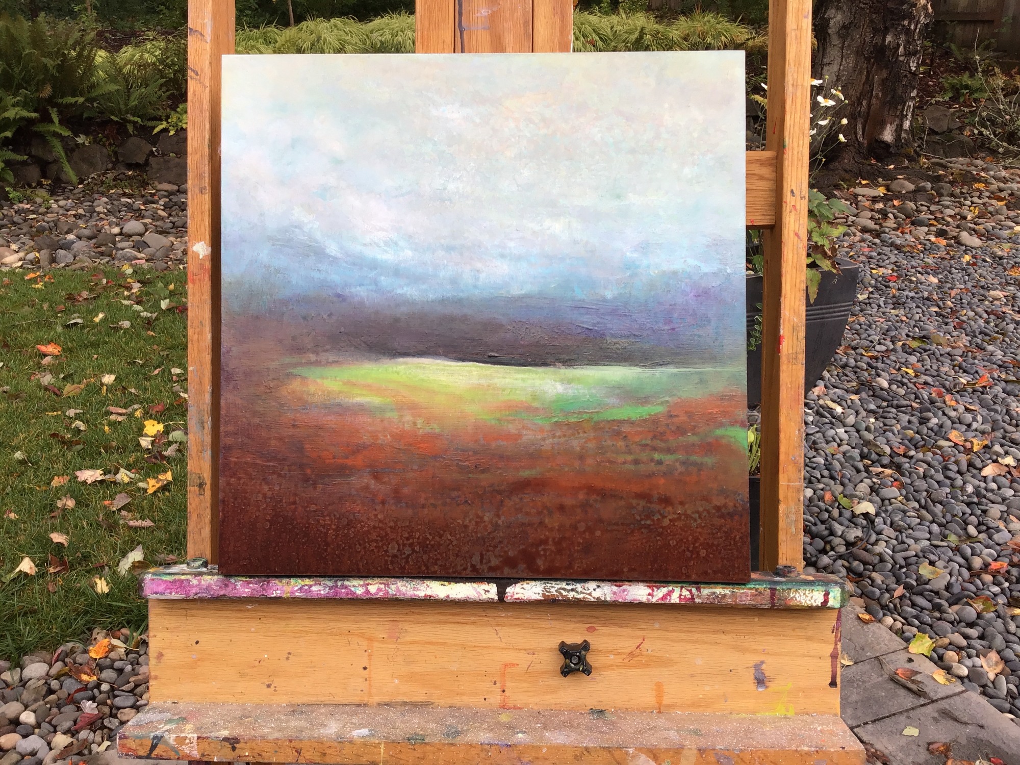 PROCESS: Latham enjoys experimenting with a variety tools and viscosity of paint to discover the textures and shapes that reveal the landscape over time. An integral feature of her painting is the use of rich translucent colors to create depth and visual texture.