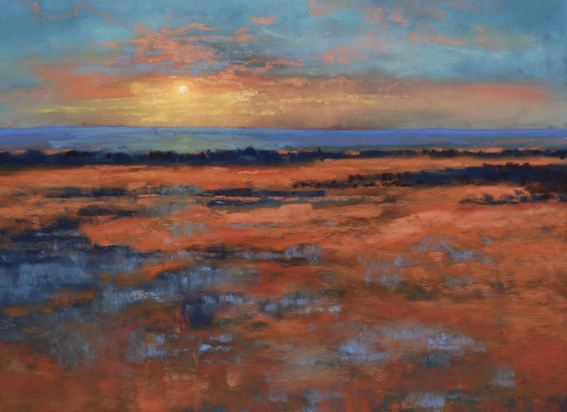 I was lucky to have a clear view to the east and west while on the island with water all around me. The sunrises and sunsets were spectacular because they were reflected in the water and bathed my surroundings with ethereal, wondrous light. I would awake very early every morning to catch the rising sun and made a point to be ready to watch it dip below horizon after a day of birdwatching and painting. How lucky can an artist be?