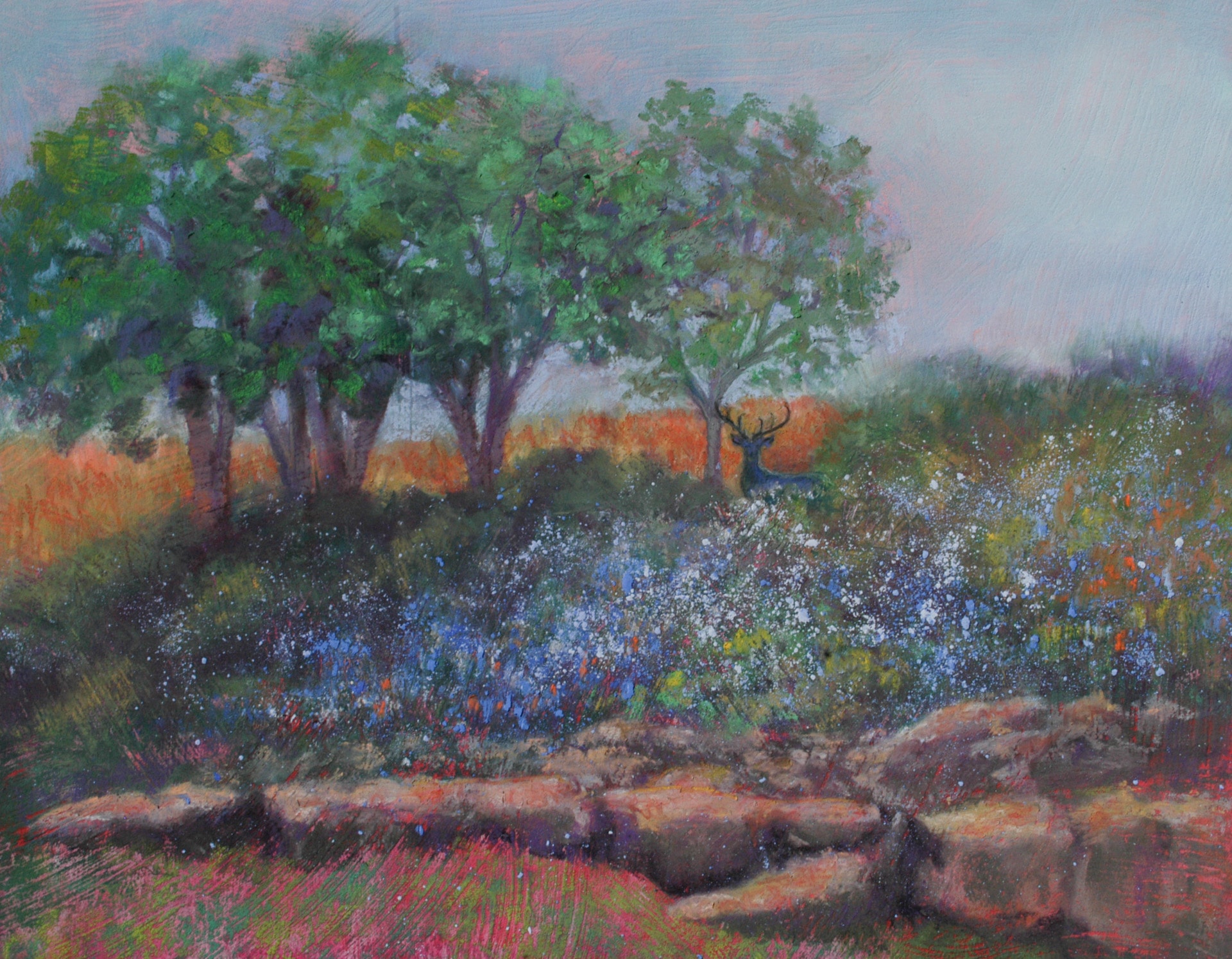 My travels to Texas for my artist in residency experience could not have come at a better time of year. I was able to spend some time in the Hill Country where I was inspired every day by the Bluebonnets and the abundant wildlife. While I was painting a lovely landscape in Horseshoe Bay, near Marble Falls, I hunted with my camera and I had several visitors. I took a little bit of artistic license and imagined the antlers on the one who stayed the longest.