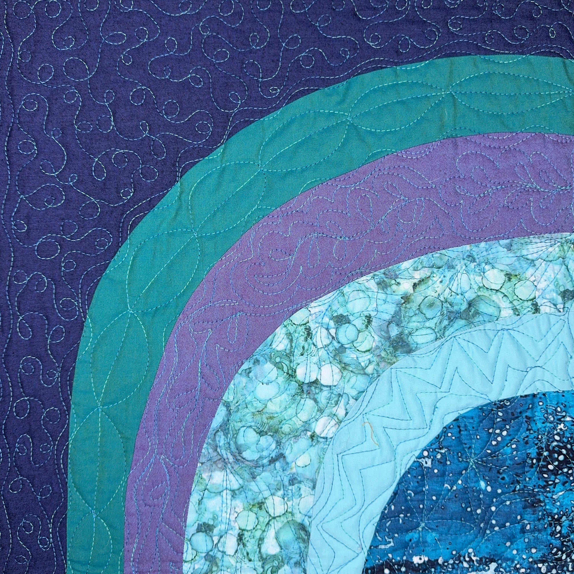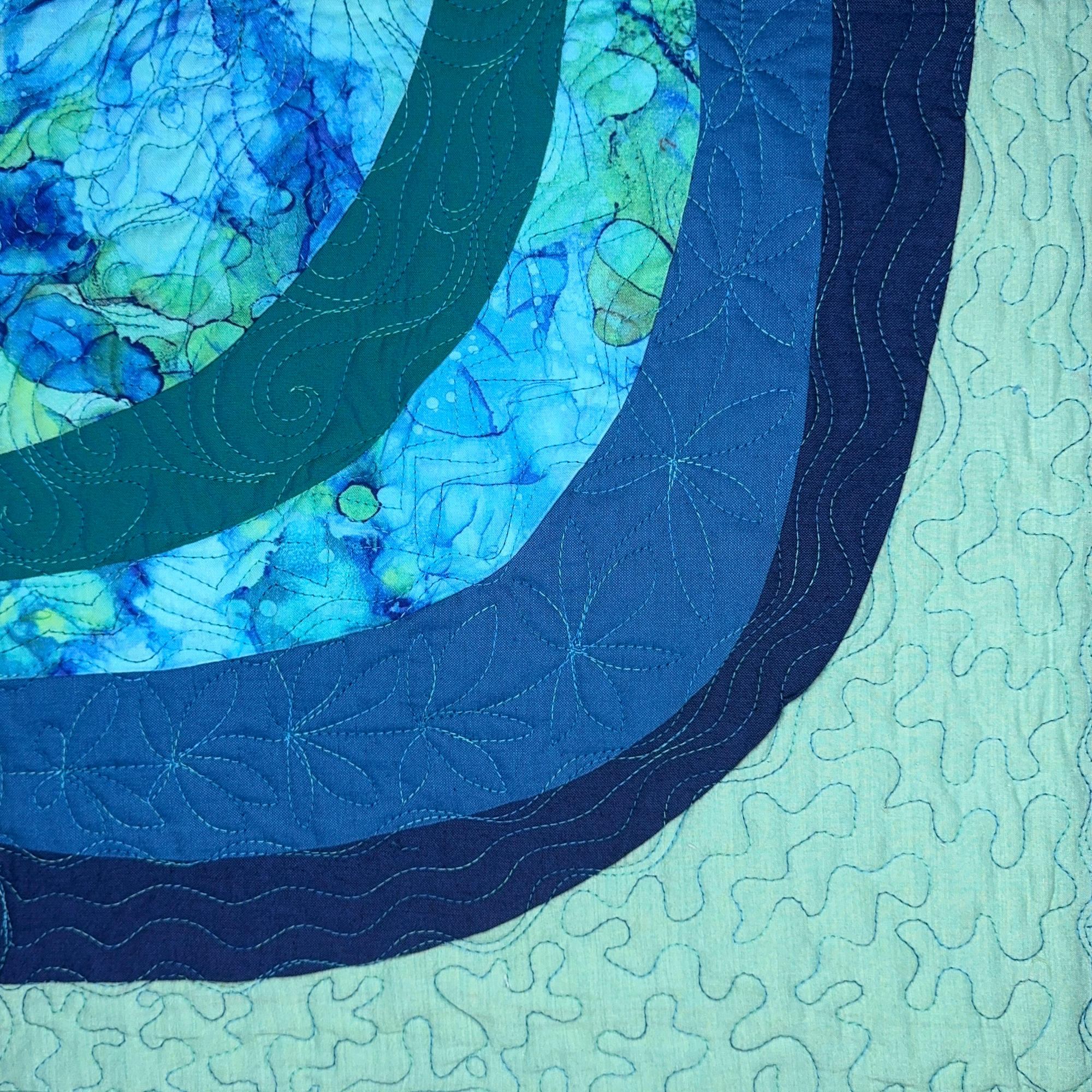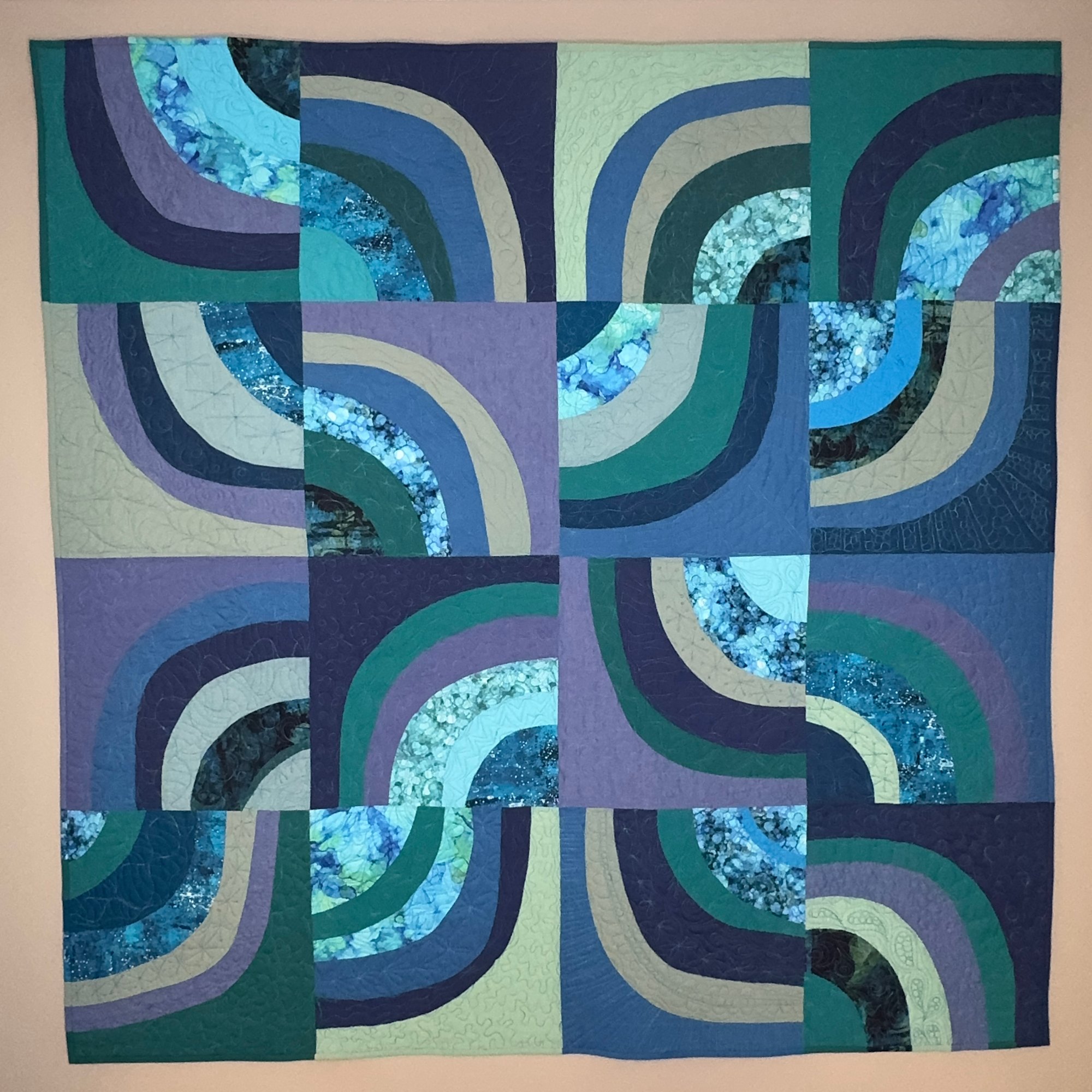 An exploration of “spontaneous curves”, an improvisational twist of the traditional Drunkards Path block. This piece is part of a series exploring how multiples of a single block design can be arranged in various directions to create unique patterns using Truchet tiles.