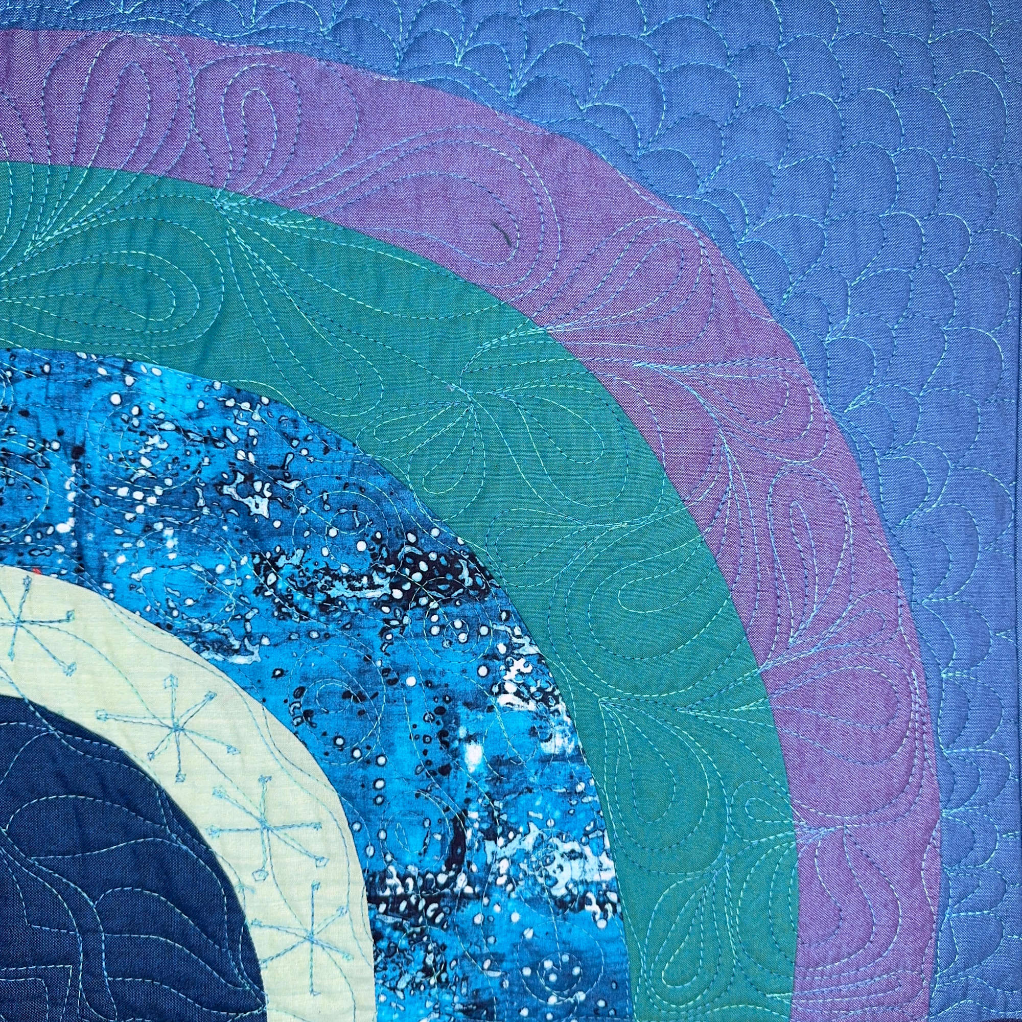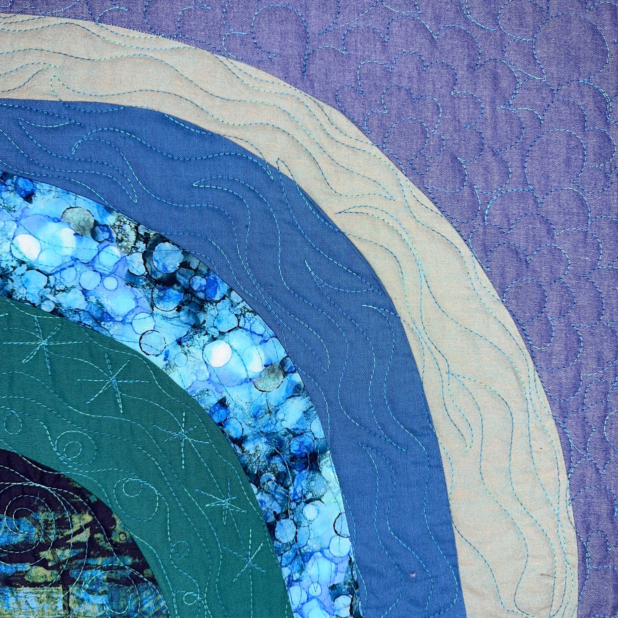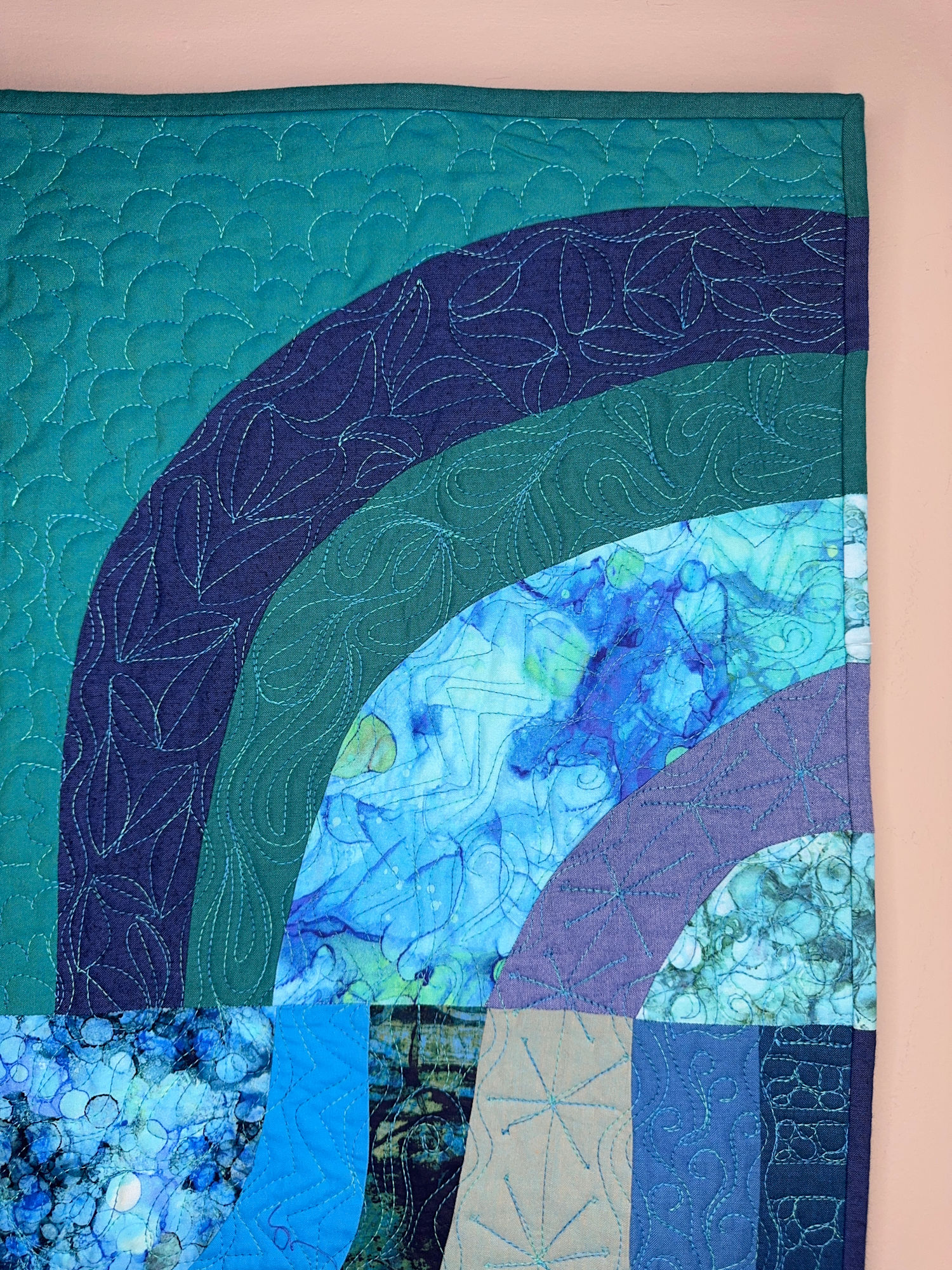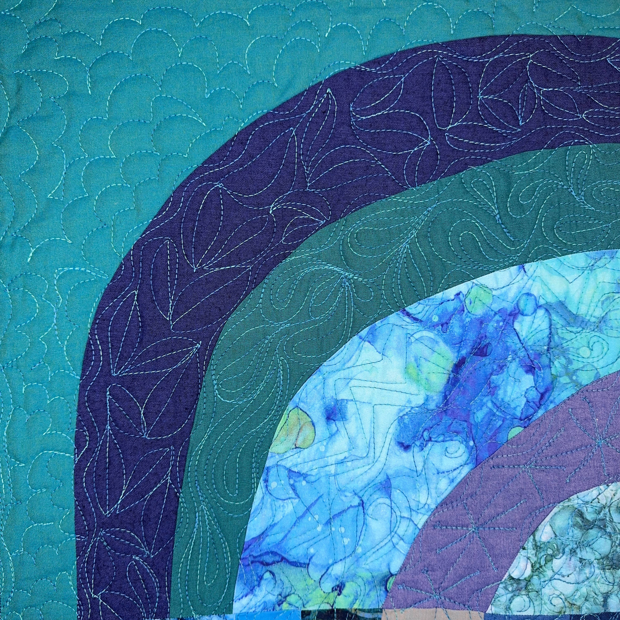 An exploration of “spontaneous curves”, an improvisational twist of the traditional Drunkards Path block. This piece is part of a series exploring how multiples of a single block design can be arranged in various directions to create unique patterns using Truchet tiles.