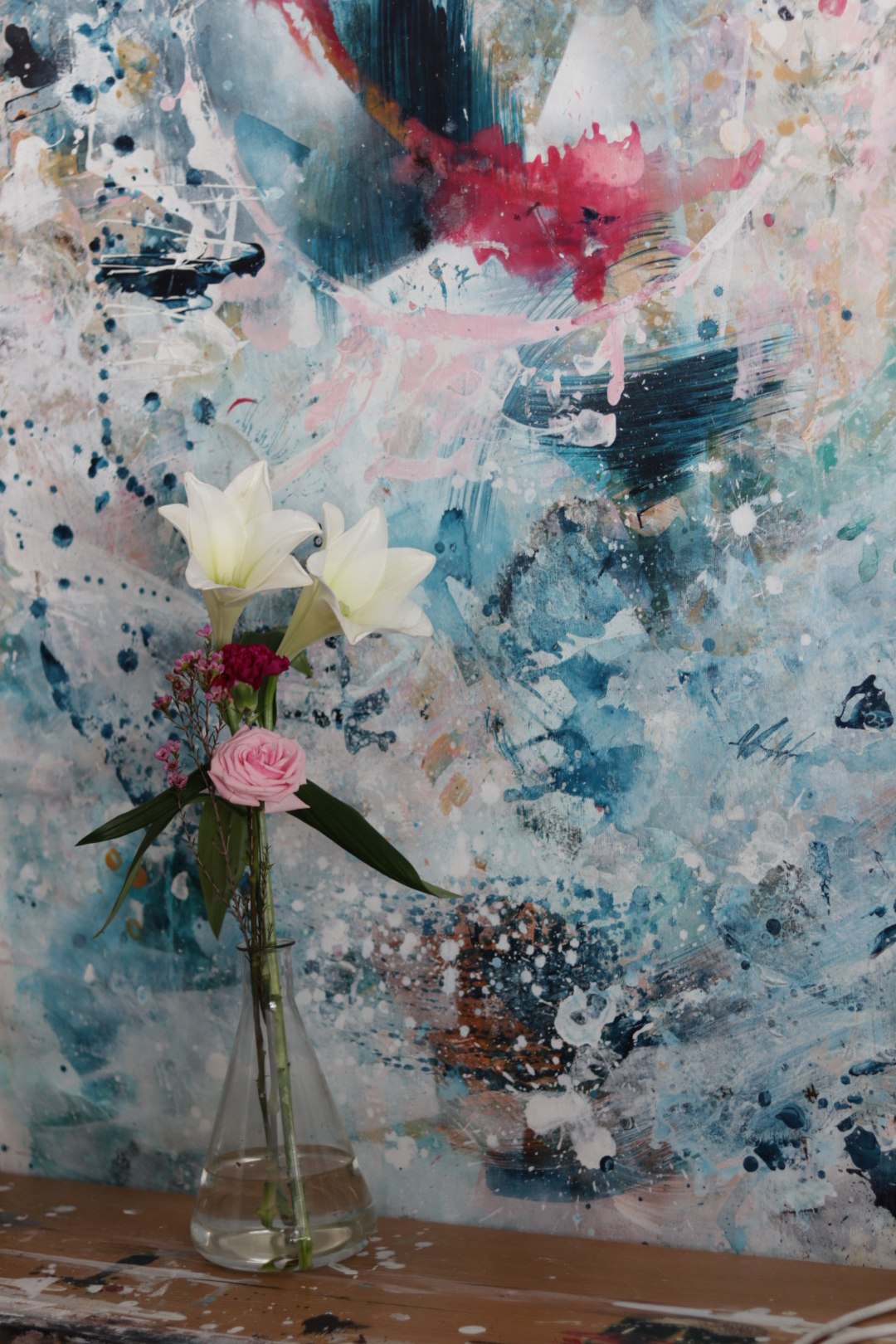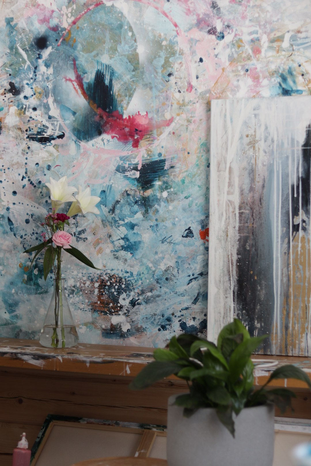 This series is fun, and reflects the joy of creating freely without the fear of mess. I protect my atelier floors with large high-quality canvases and paint most of my other works splashing paint on the floor. These canvases pick up all splashes and drips and also work as mixing pallets and brush cleaning cloths. This ensures that no paint is going to waste and no floor covers are thrown to the bin. All paints in these beauties are leftovers from other paintings - recycling at it's finest!