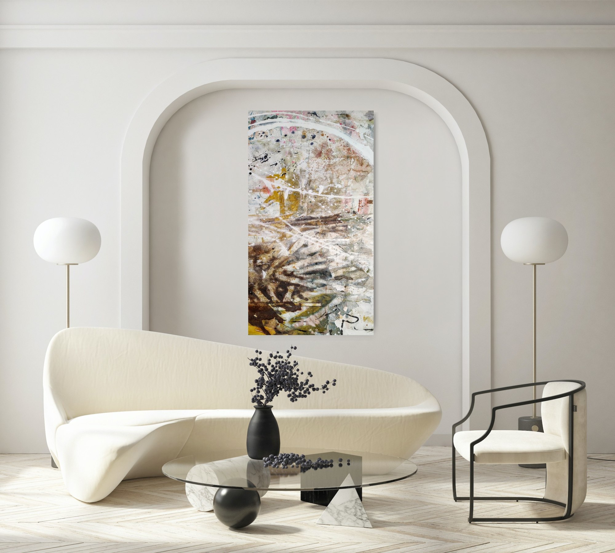 These paintings are like thoughtful, beautiful accidents. I do plan where to paint with different colors to make beautiful, very different Pieces of my Space. Most of the shapes emerge naturally as I work on top of the canvas for a few months, which ensures that there’s many memories and stories in each Piece.
