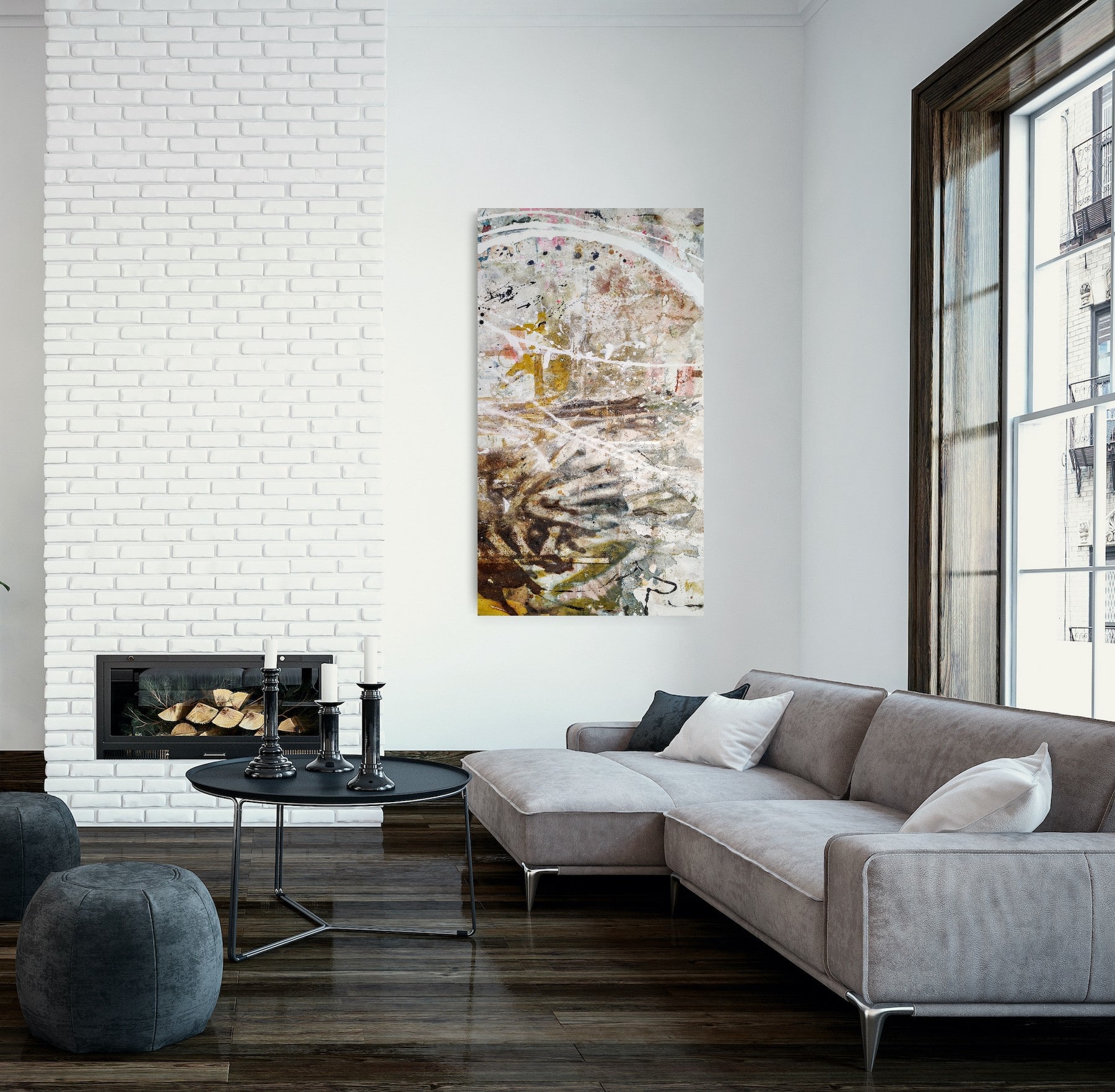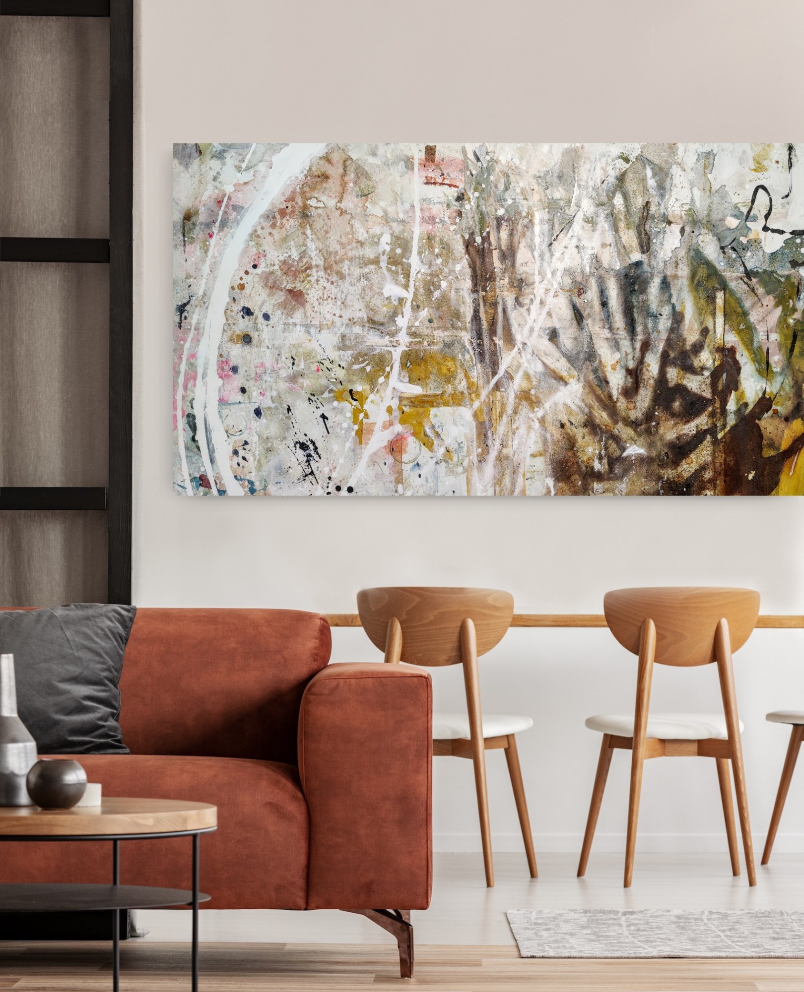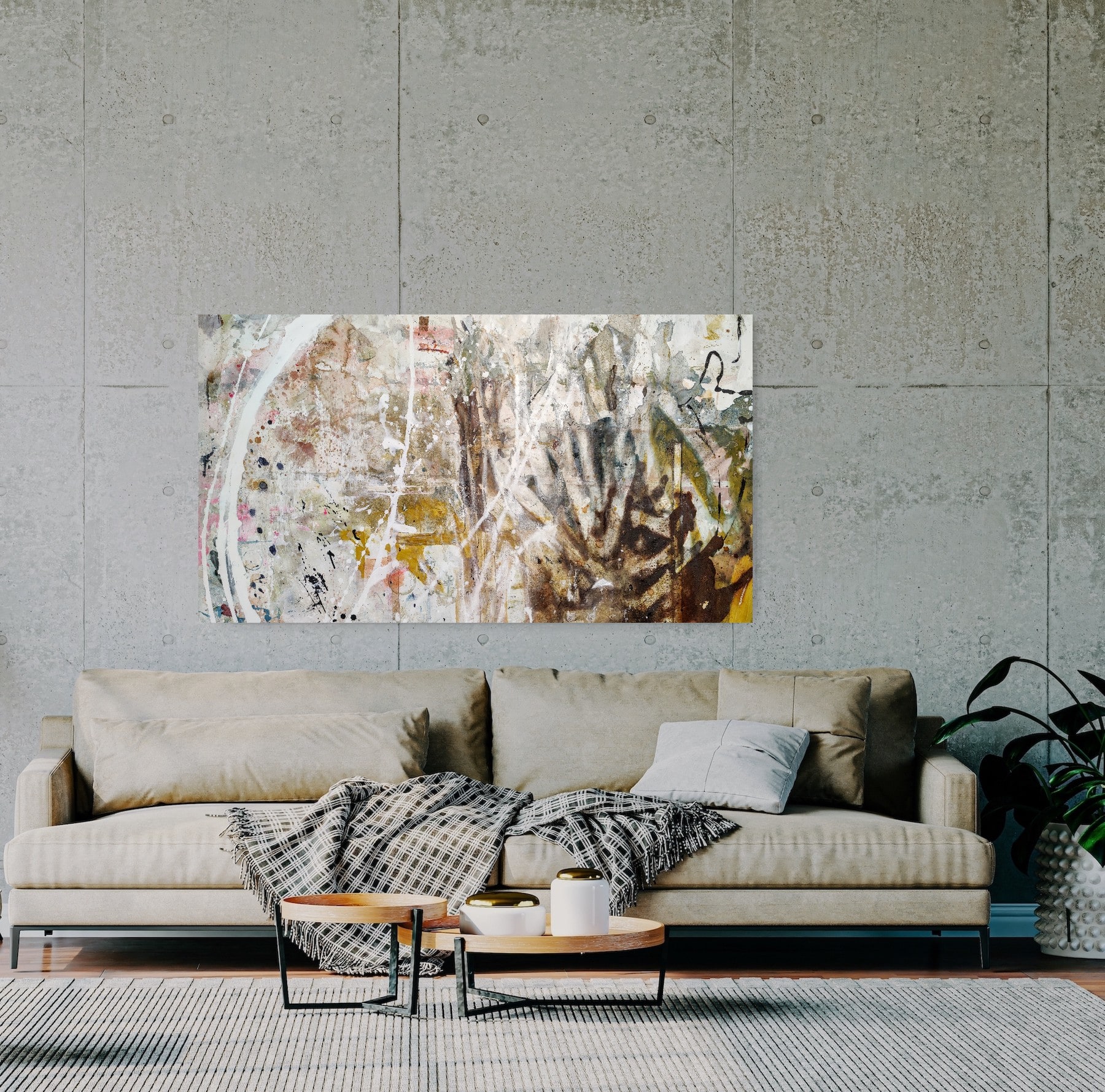 These paintings are like thoughtful, beautiful accidents. I do plan where to paint with different colors to make beautiful, very different Pieces of my Space. Most of the shapes emerge naturally as I work on top of the canvas for a few months, which ensures that there’s many memories and stories in each Piece.