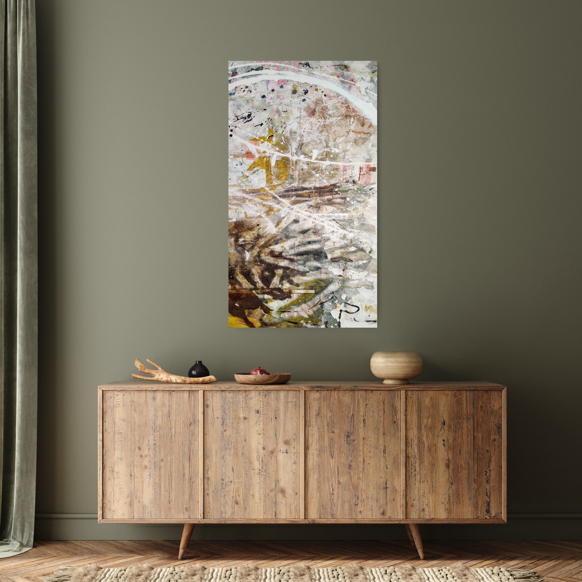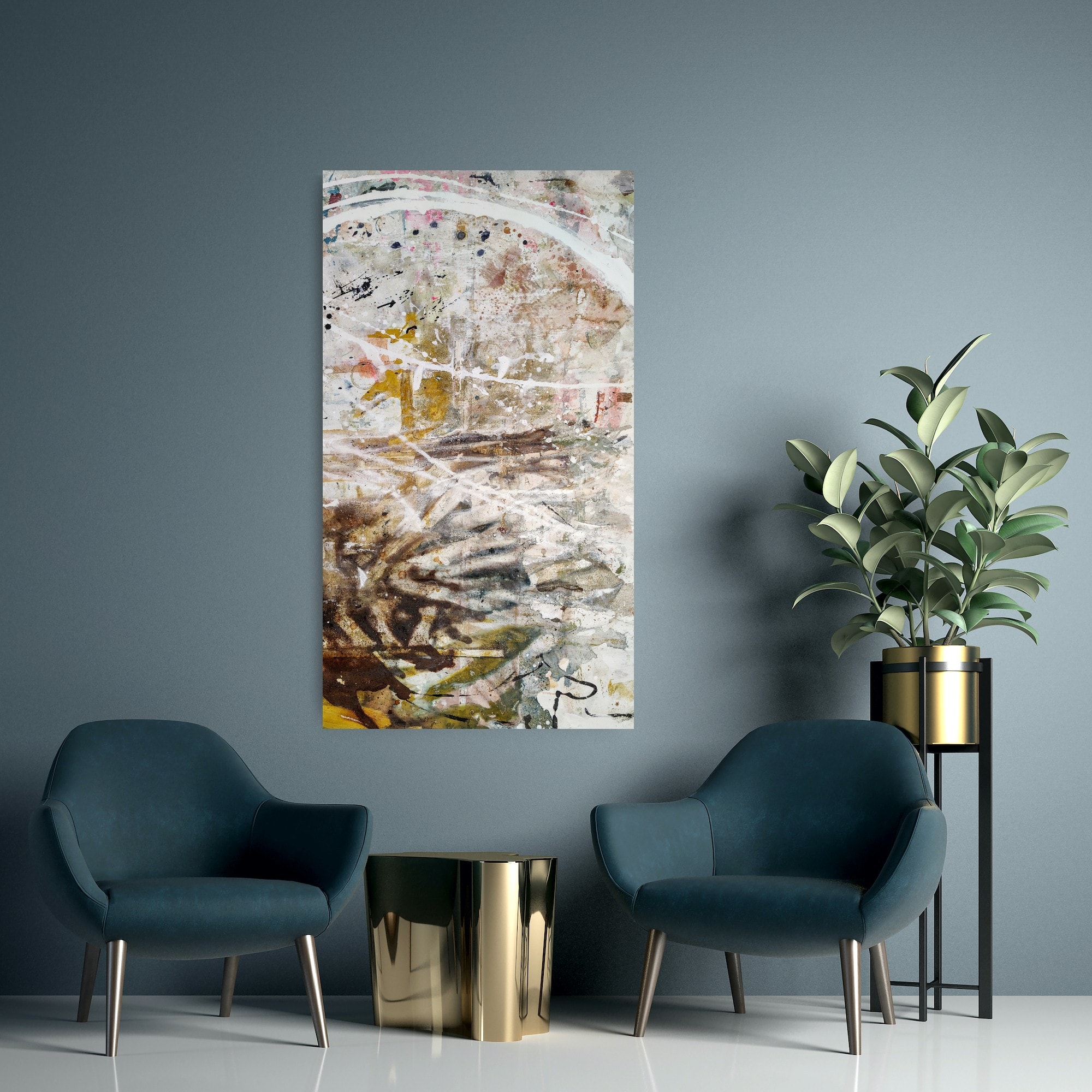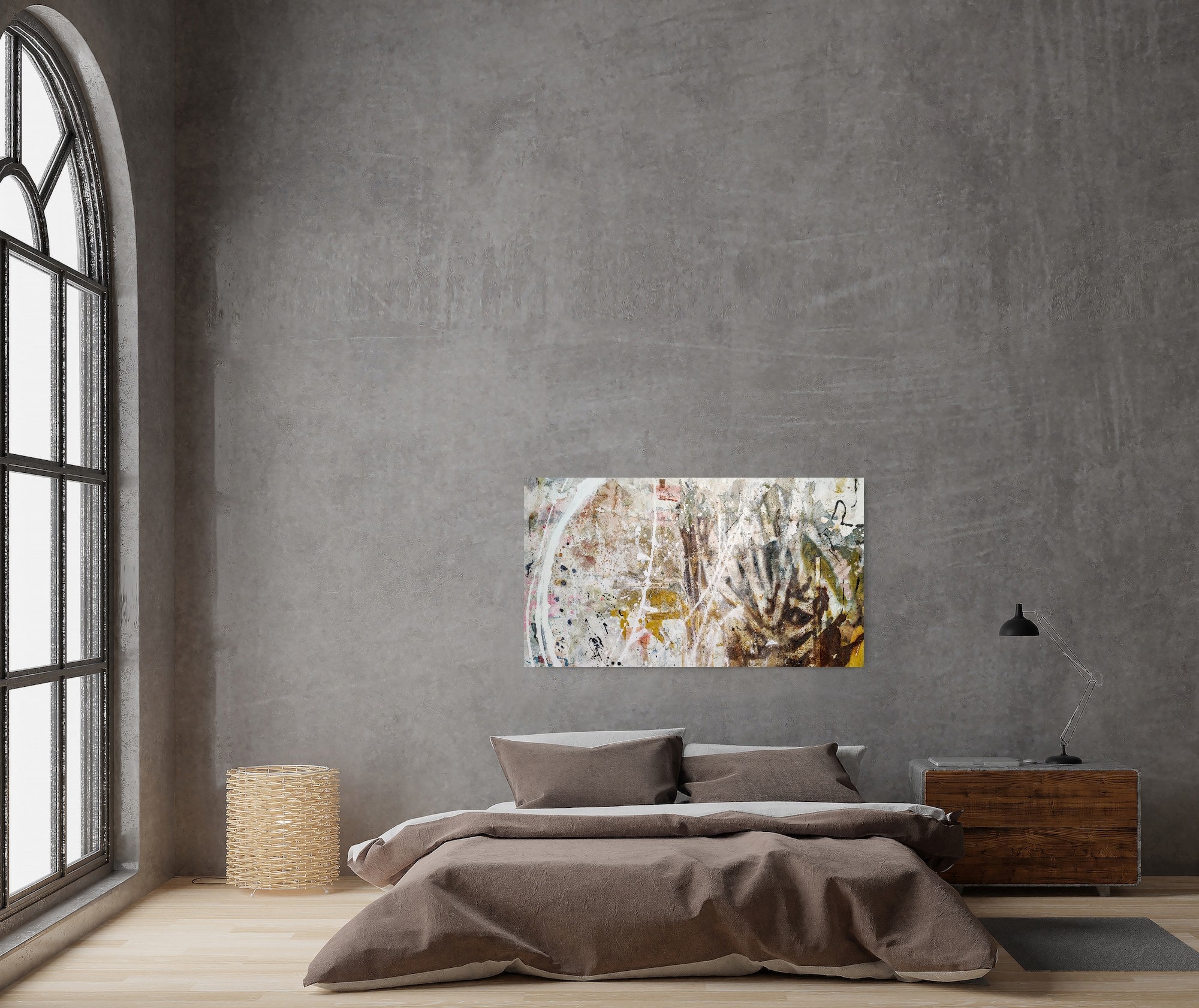 These paintings are like thoughtful, beautiful accidents. I do plan where to paint with different colors to make beautiful, very different Pieces of my Space. Most of the shapes emerge naturally as I work on top of the canvas for a few months, which ensures that there’s many memories and stories in each Piece.