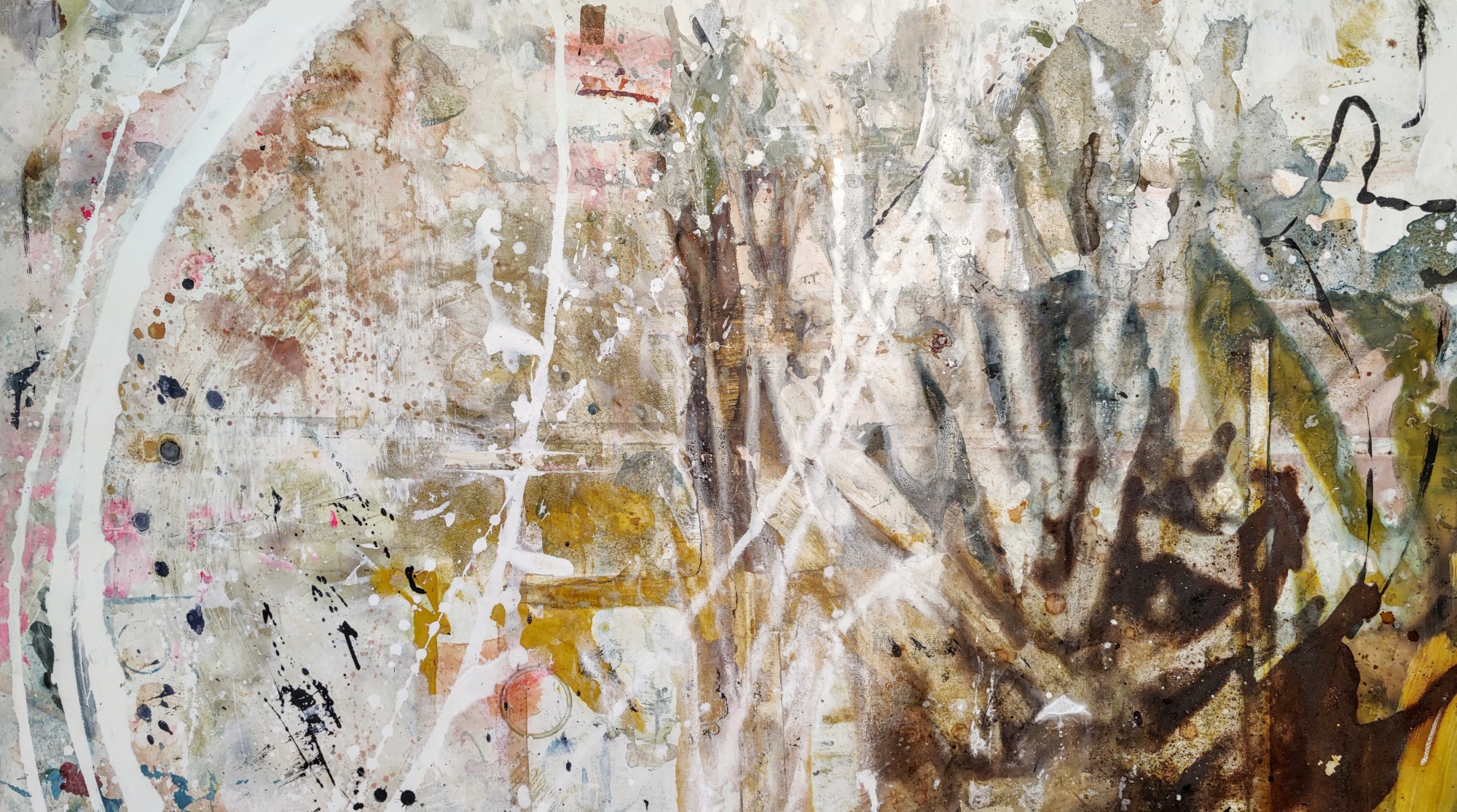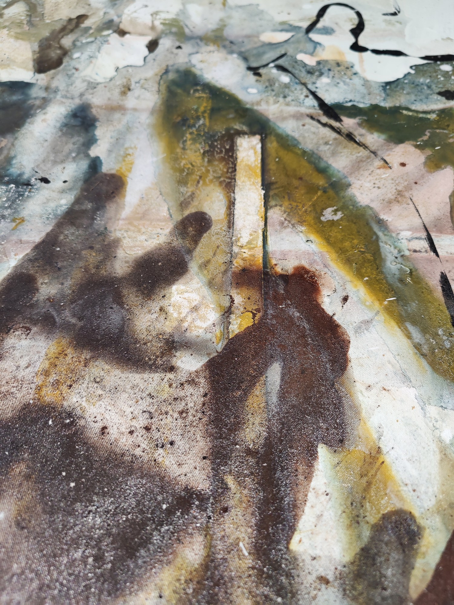 I protect my atelier floor with large high-quality canvases and I paint most of my other work splashing paint on the floor on top of these canvases. These protective canvases pick up all splashes and drips, also working as mixing pallets and brush cleaning cloths. This ensures that no paint is going to waste and as little as possible will be washed to the sewer. All paints in these beauties are leftovers from other paintings!