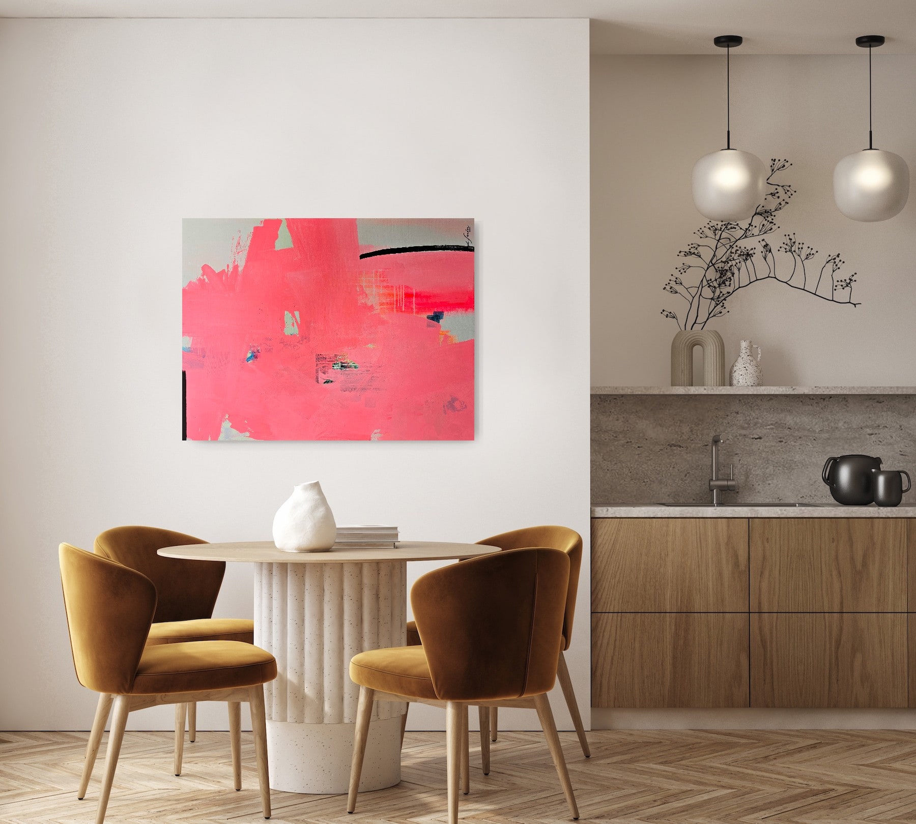 Strong pink abstract painting. A real statement piece for any modern space. It took me three years to finish it because first it had more neon colors and my dad and his wife liked it and hung it on their wall for a year or so. I never felt like it was ready though, so in 2024 I took it back to my easel and went crazy with my current favorite painting color: neon pink. And suddenly it clicked! Now I’m obsessed with it!