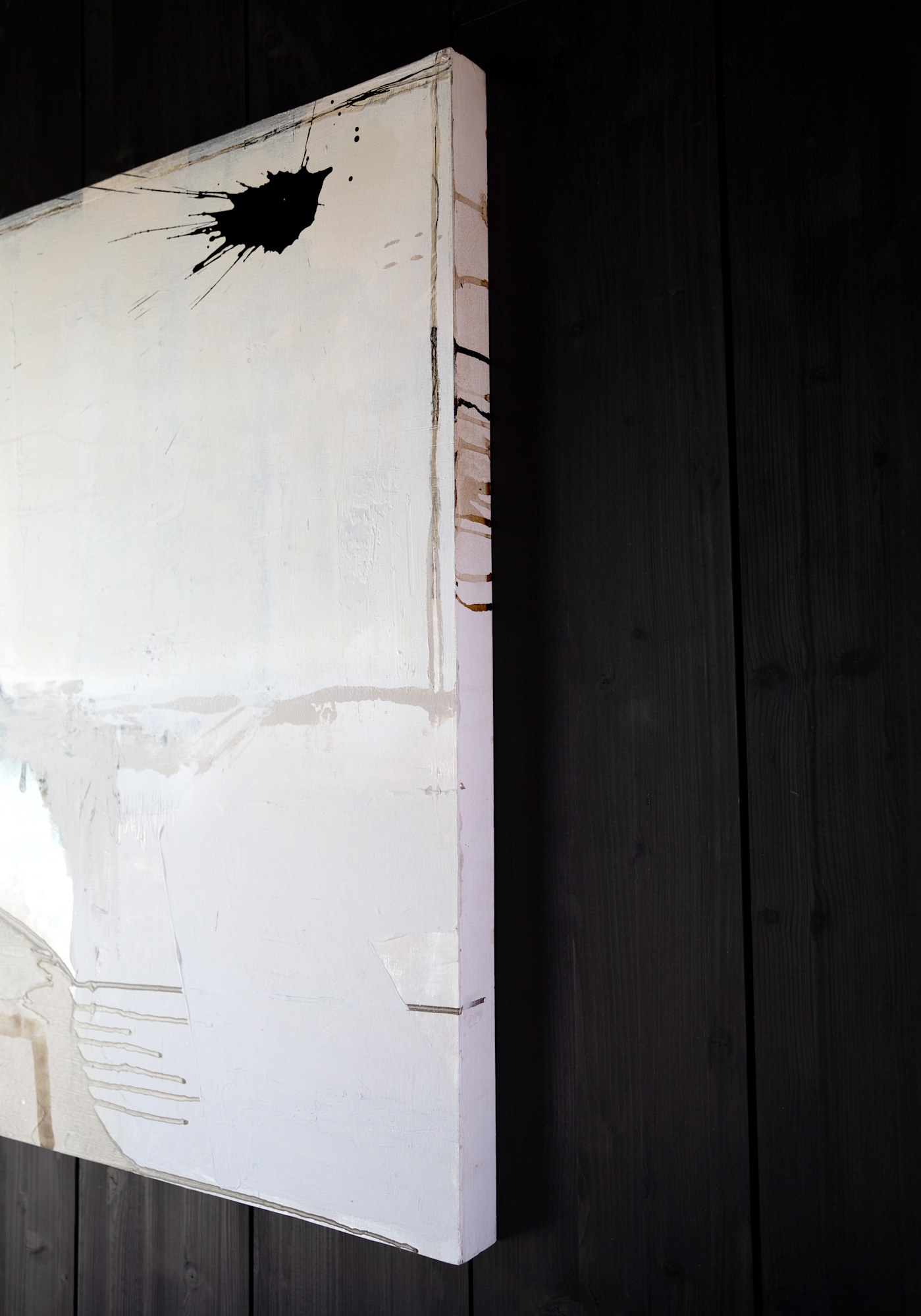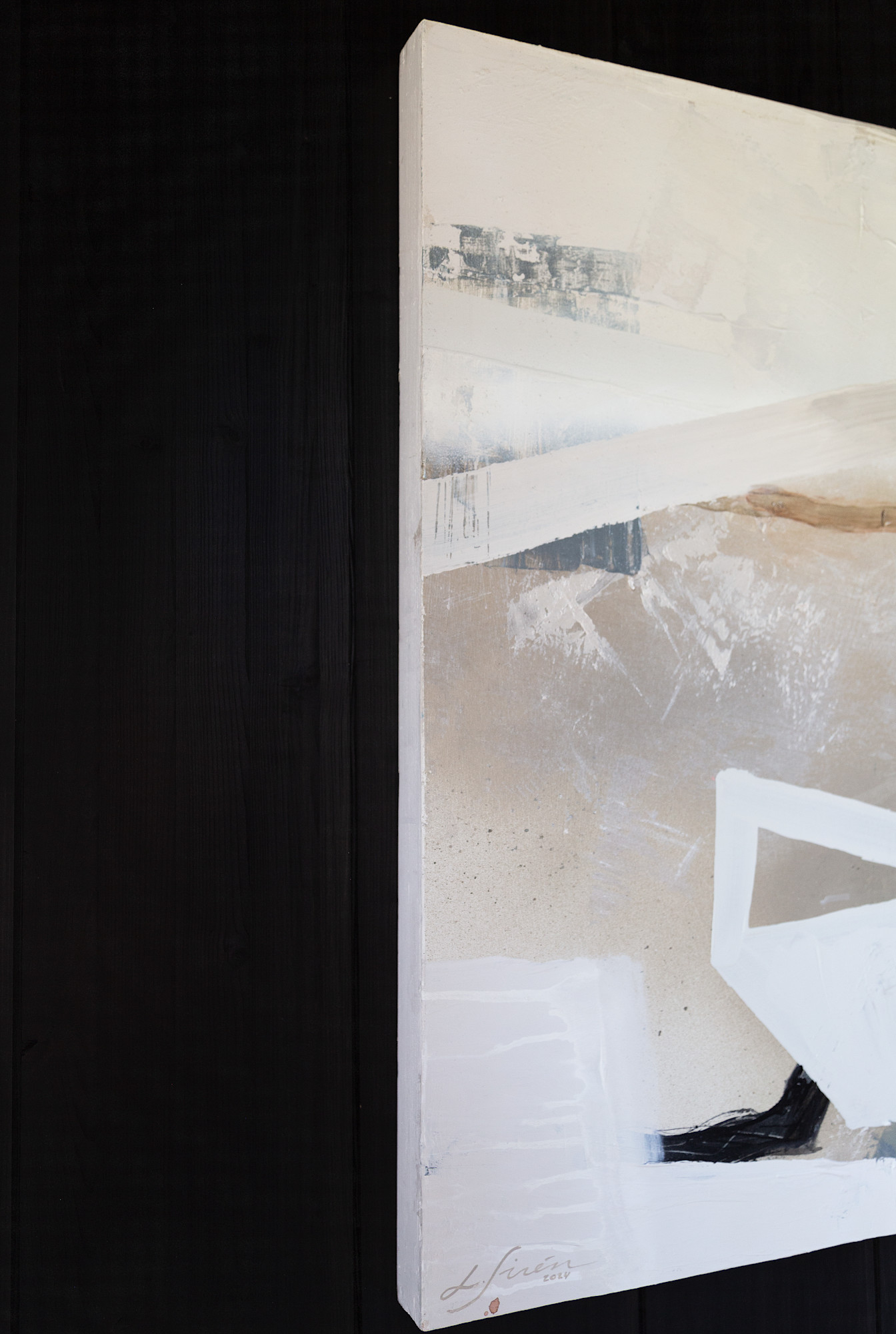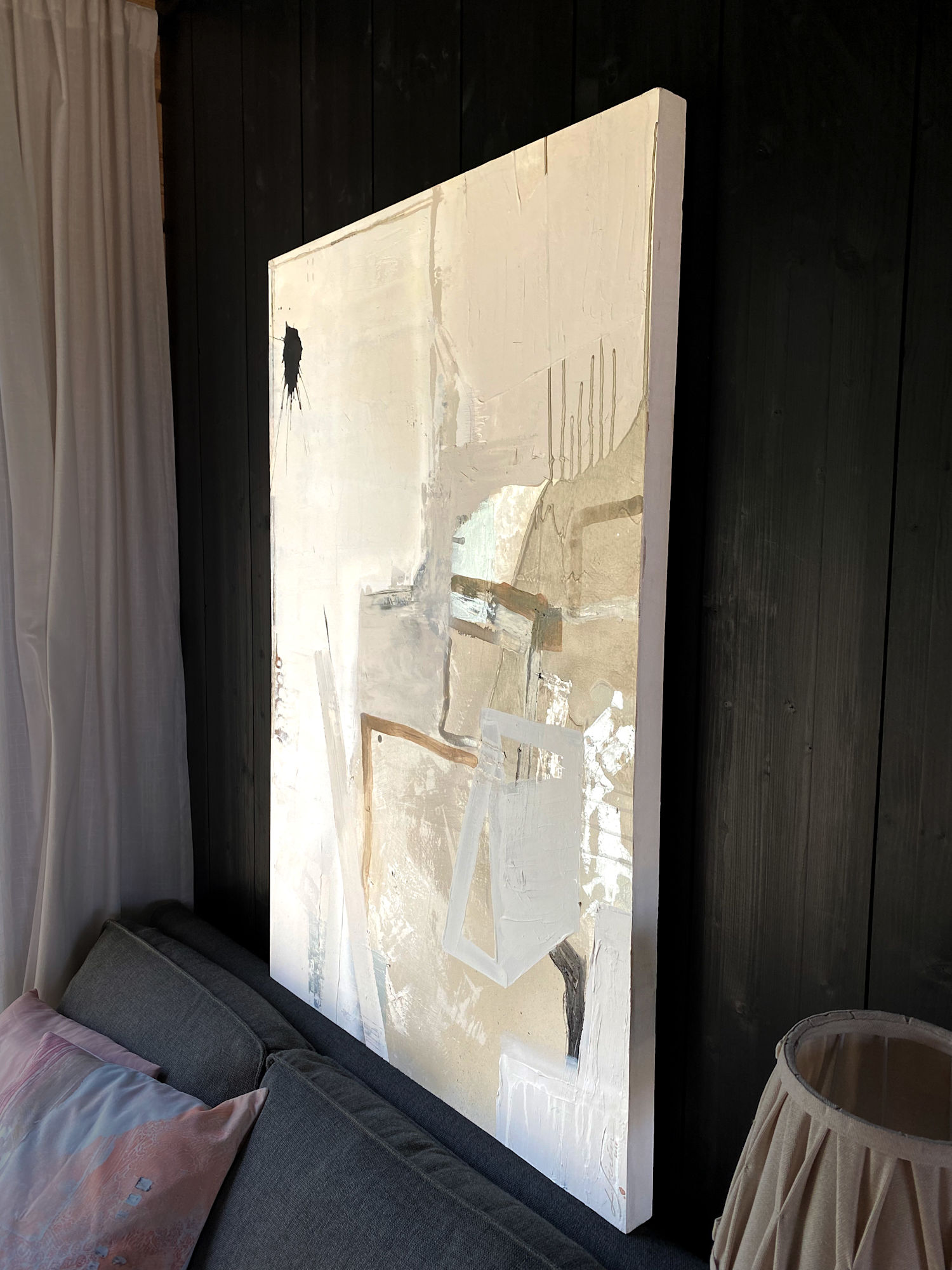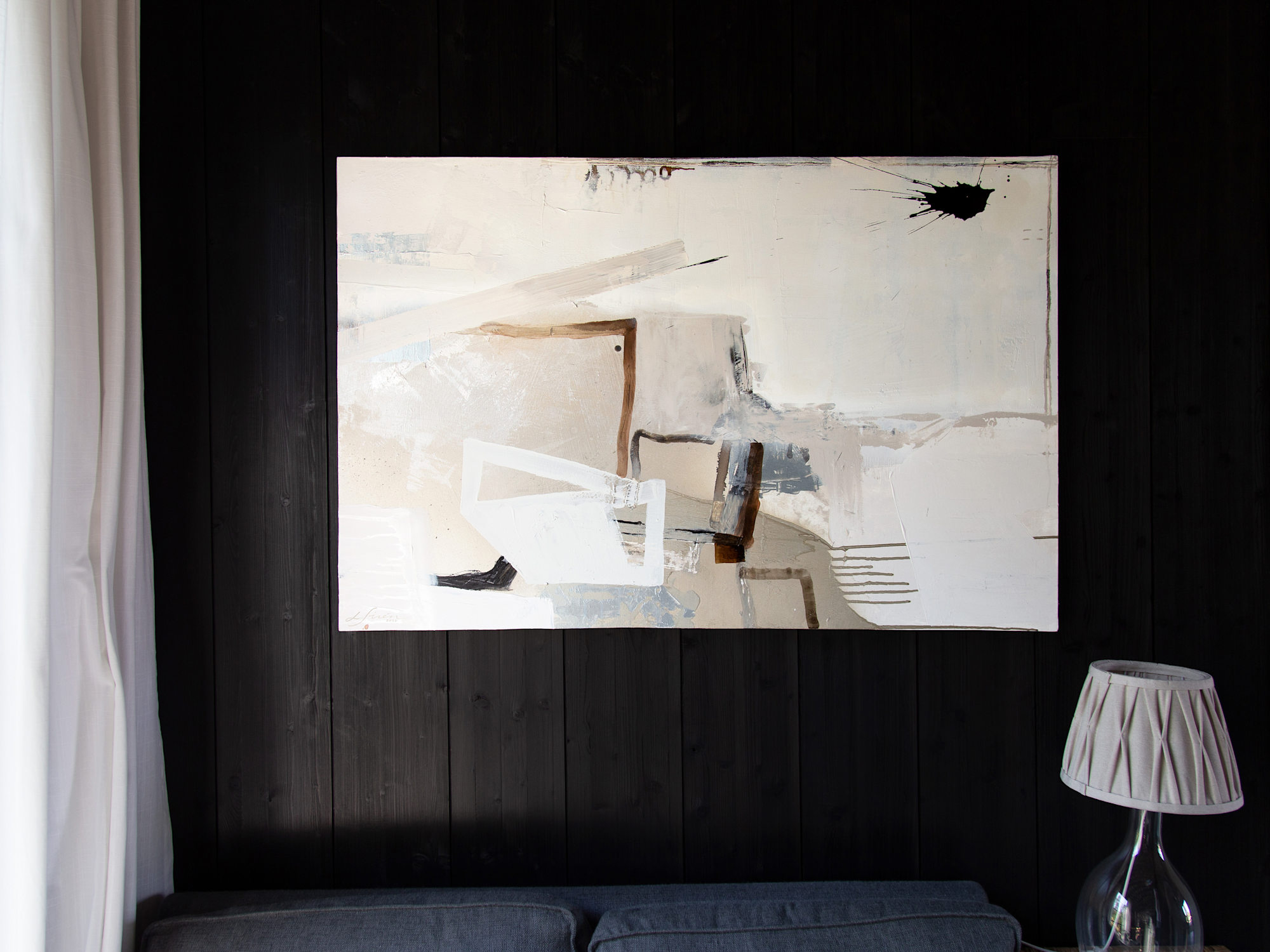 To make this piece extra special, matte and shiny elements play together in beautiful harmony. When you walk pass the painting, the silvery parts turn from cold blue to bright white in the right light. The calming natural tones with deep black are inspired by Scandinavian design and Japandi style.