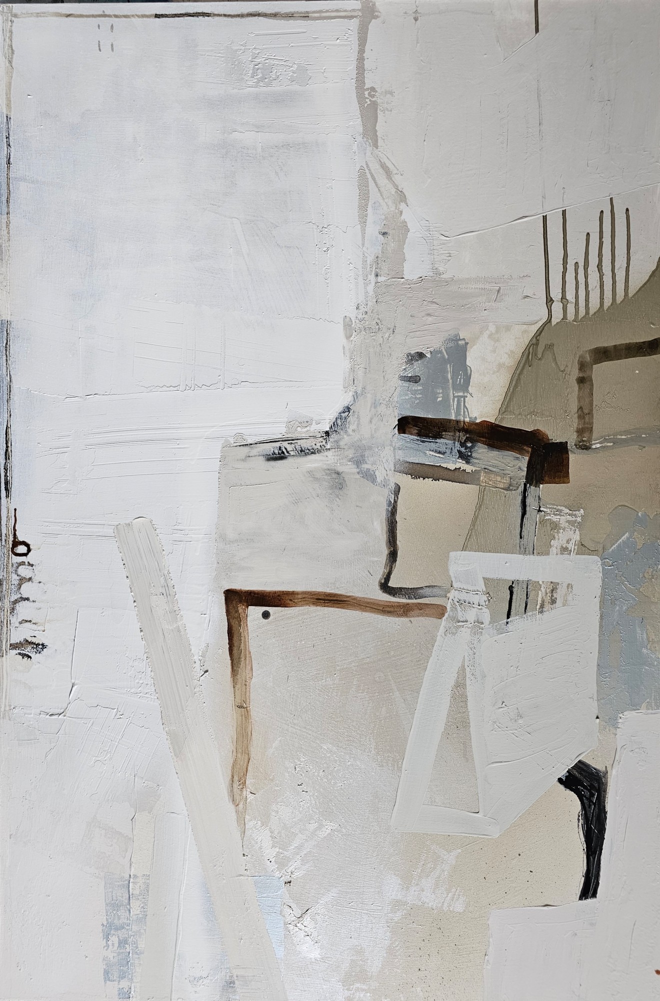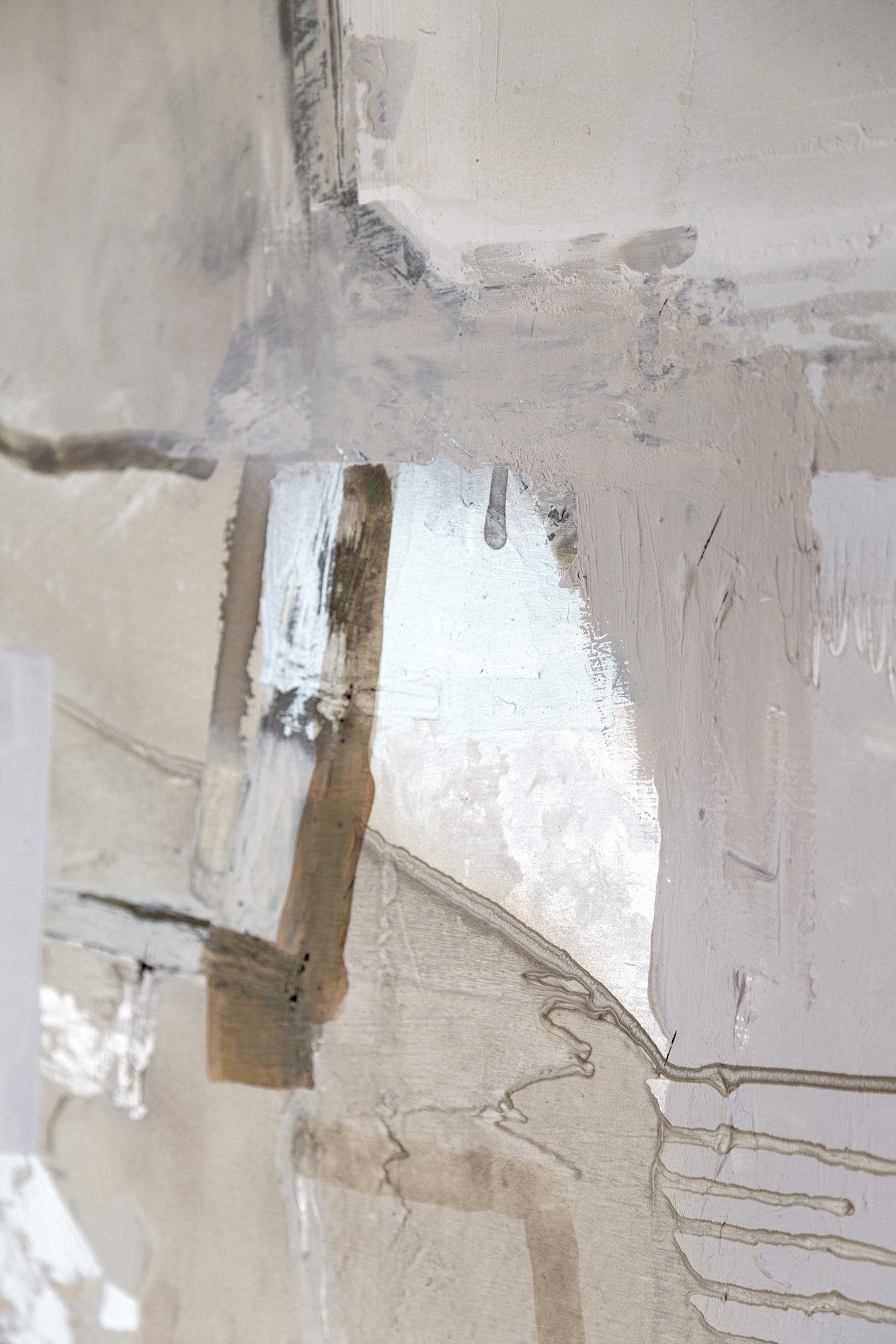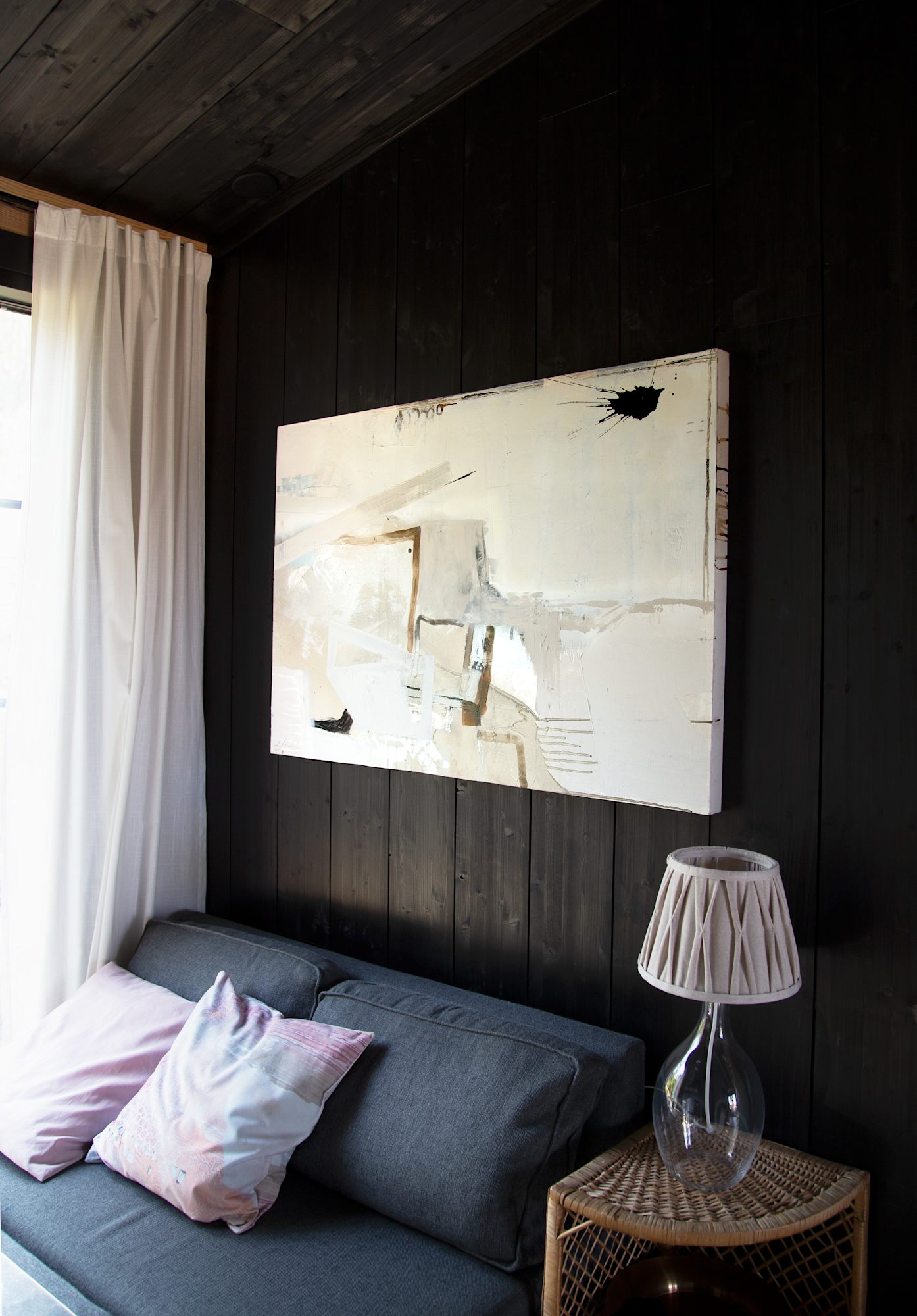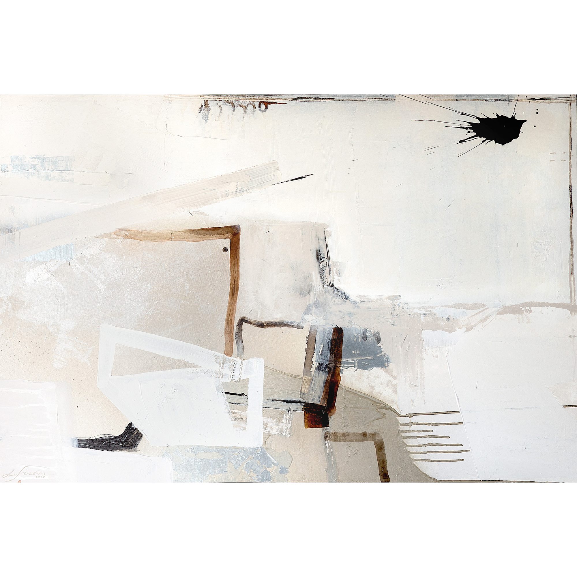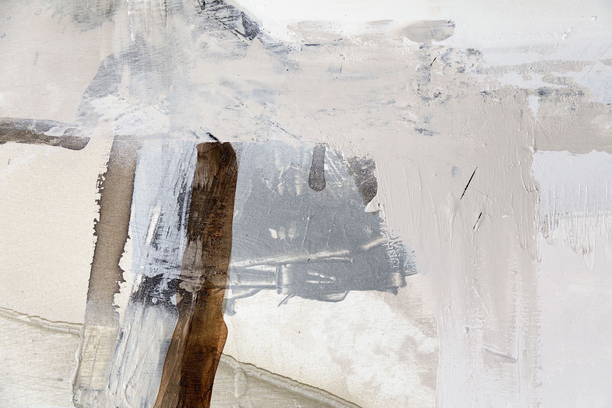 To make this piece extra special, matte and shiny elements play together in beautiful harmony. When you walk pass the painting, the silvery parts turn from cold blue to bright white in the right light. The calming natural tones with deep black are inspired by Scandinavian design and Japandi style.