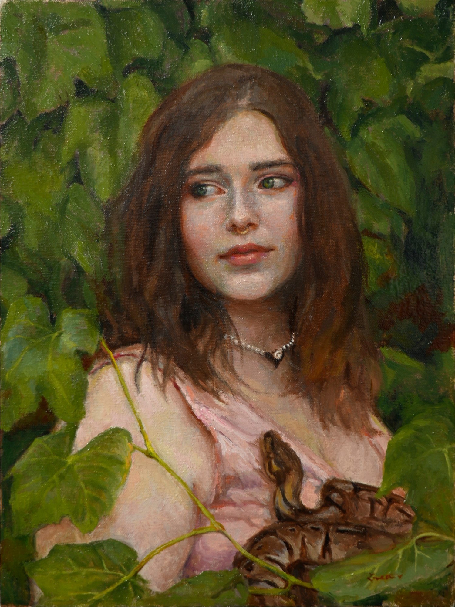 This painting harkens to Eve's story in the garden of eden and humankind's ability to choose. I have been contemplating our ability to make decisions. We cannot always see the outcomes of our choices, but we continually make adjustments based on the best of our knowledge. If we could clearly see the future, or if there were no opposition, then would we really have agency?